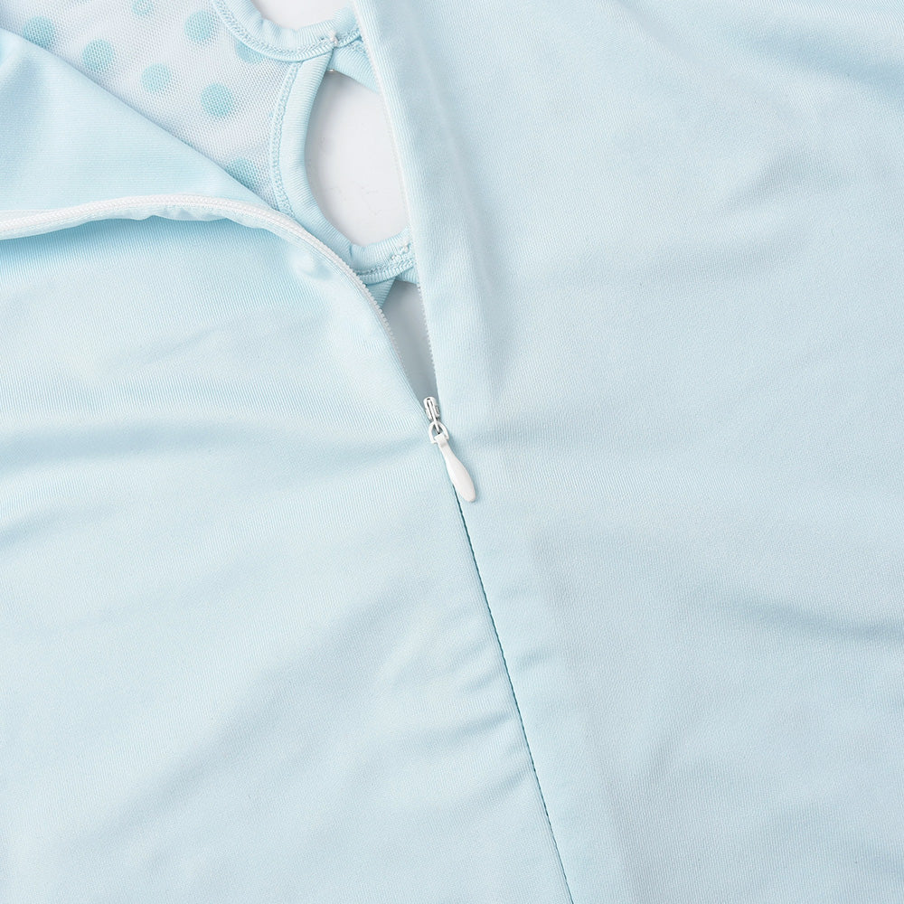 This sleeveless romper features a sky blue color and a hollow-out design. The polyester material is lightweight and comfortable. The long sleeves provide coverage and a light breeze will keep you cool.