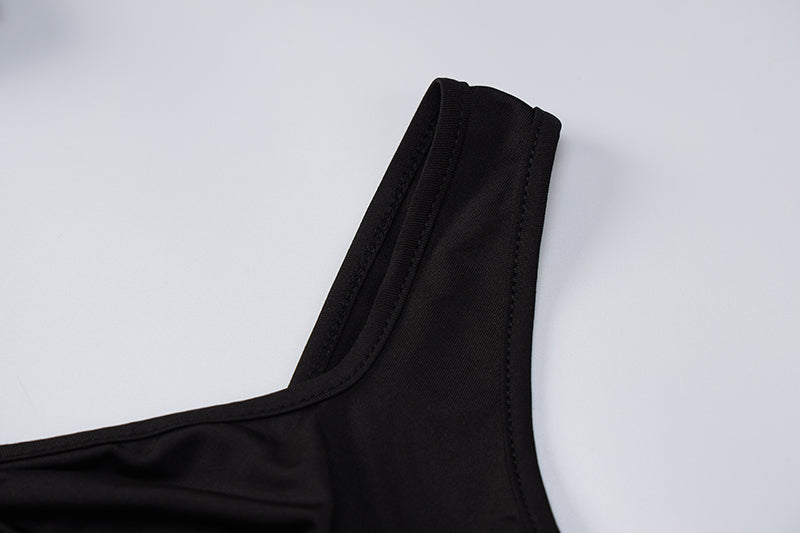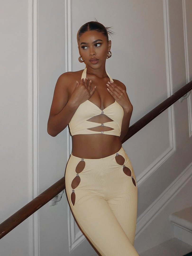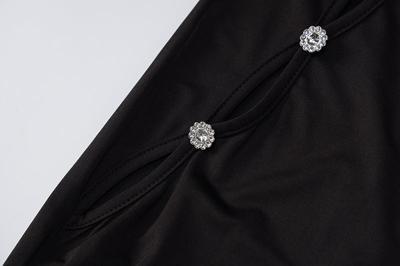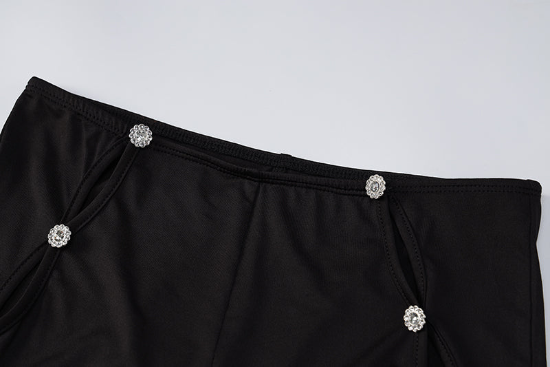 This stylish pants set is the perfect addition to any wardrobe. A basic sleeveless crop top with a square sweetheart neckline and full-length high waist pants with flared bottoms. The hollow-out design and rhinestone decoration also add more class to the solid color. A great way to add some extra style to your casual wear.