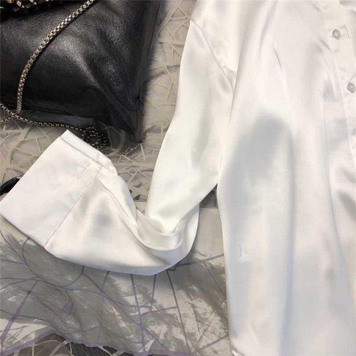 This elegant and stylish satin long sleeves women's blouse is one of the best items that you can wear to work. The sleeves are fully lined in satin and made of good quality fabric. The simple design features a turn-down collar detail. Wear with jeans or pants for a stylish and feminine look all season long.