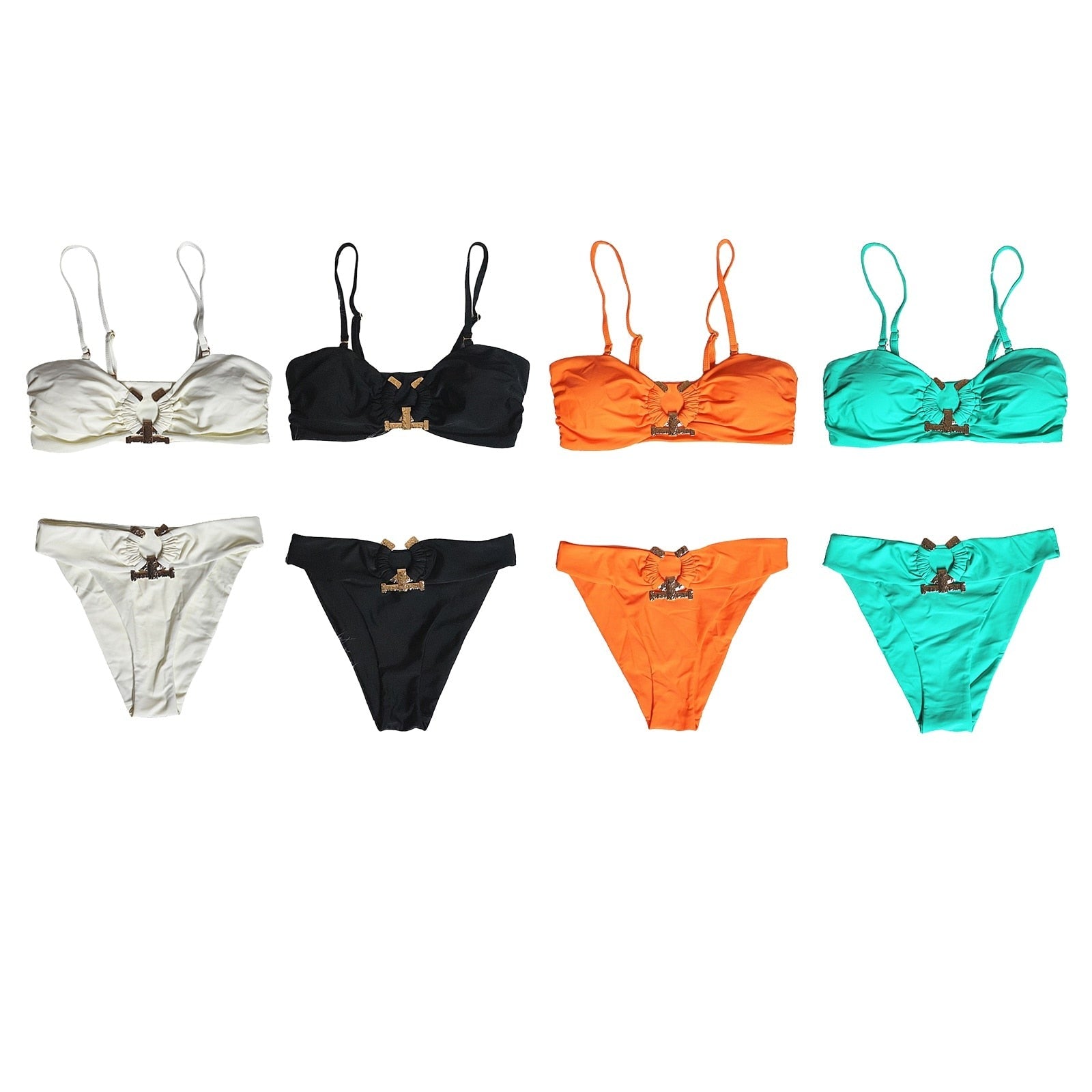 This two-piece bikini is a must-have for this summer! The stretchy bandeau top features metal appliques for an eye-catching look. The bottoms are high-waisted and feature a flattering fit. This bikini is perfect for any beach day!