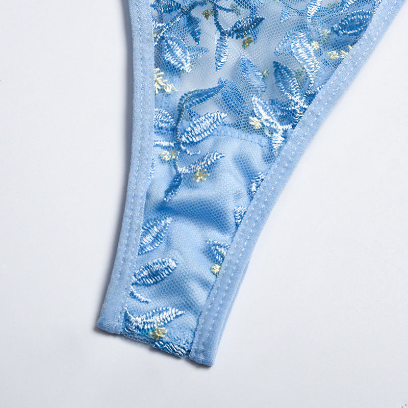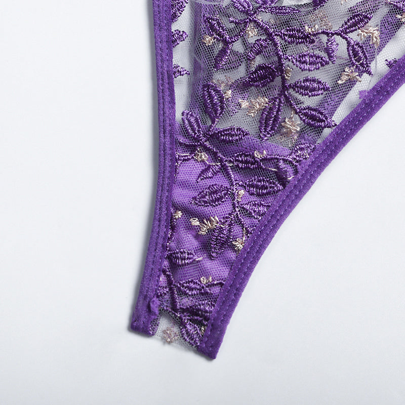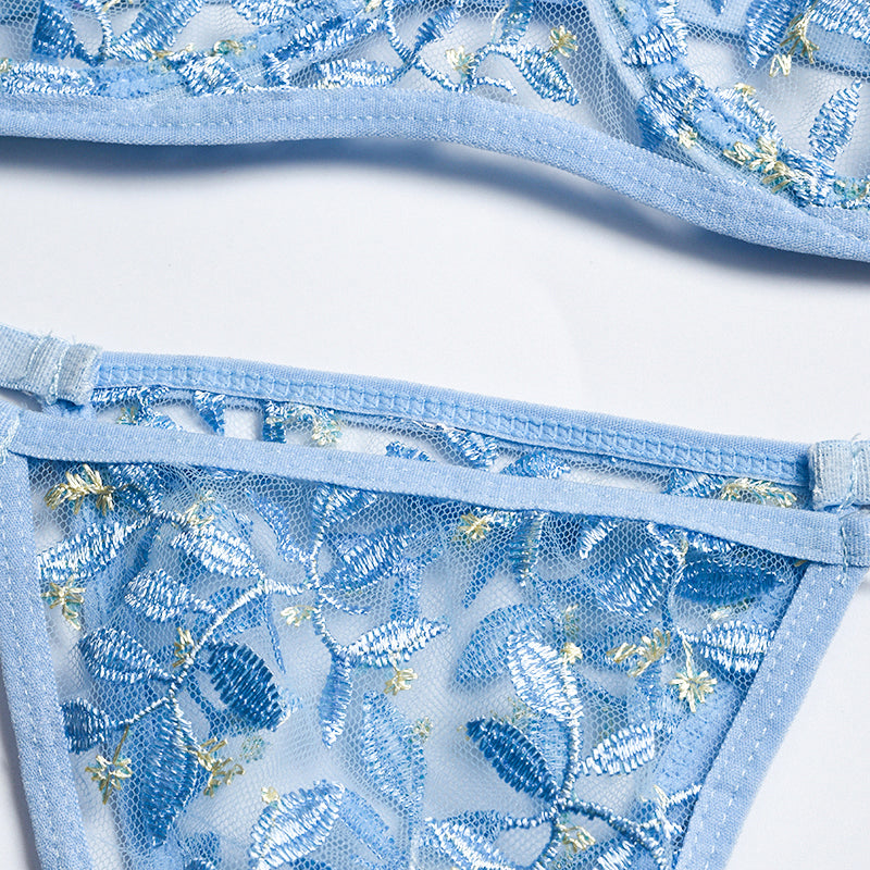 Net Polyester Bra Set with Leaf Vines Embroidery