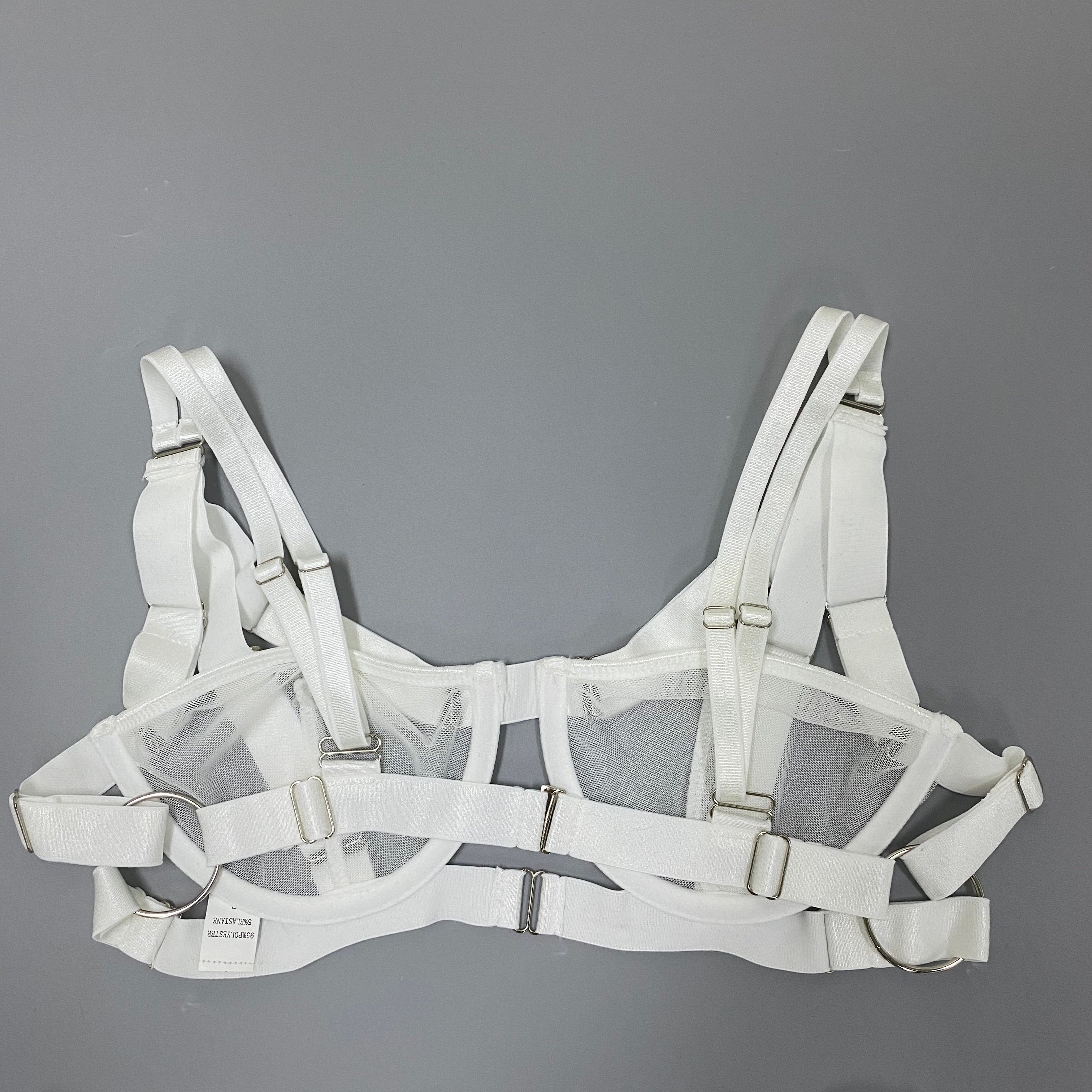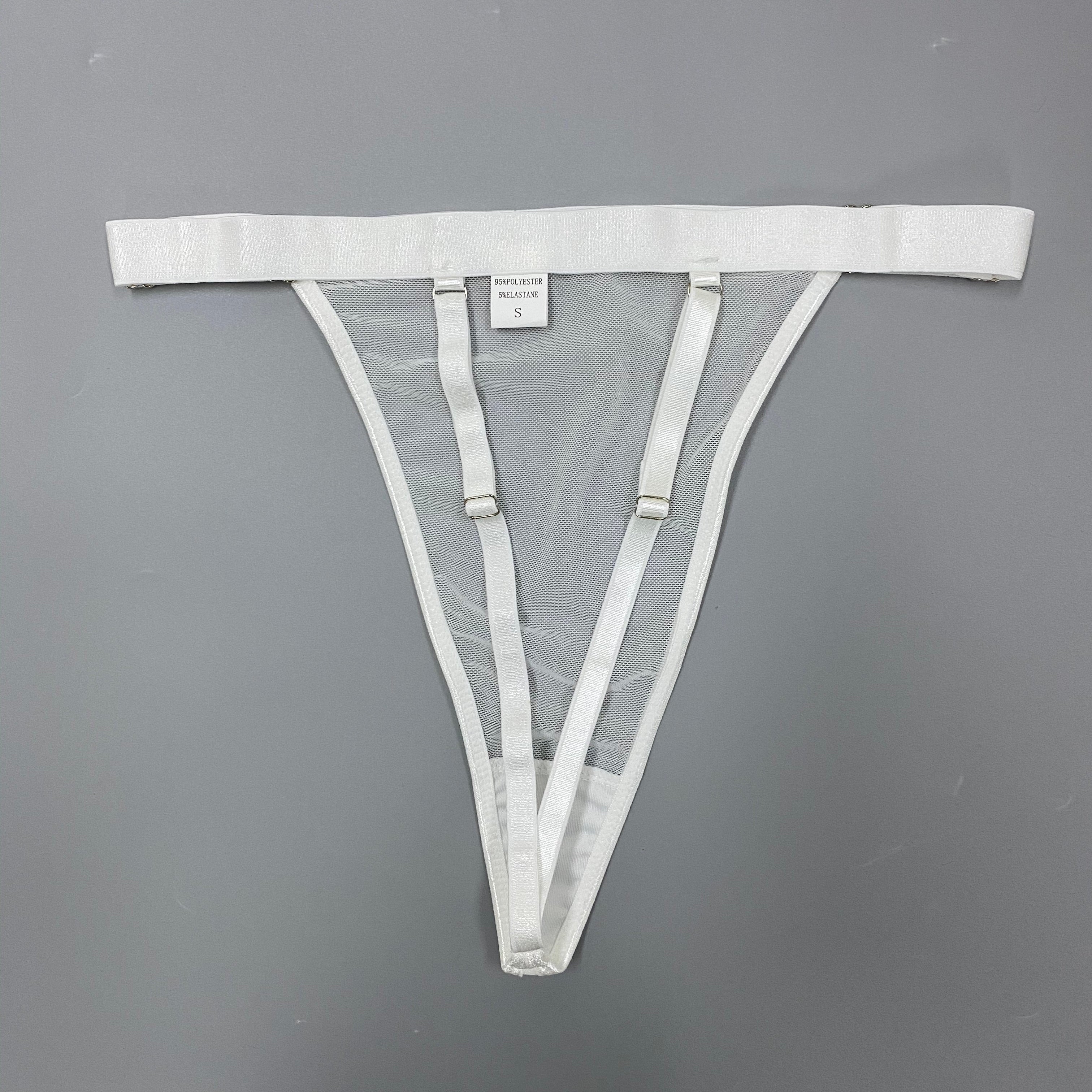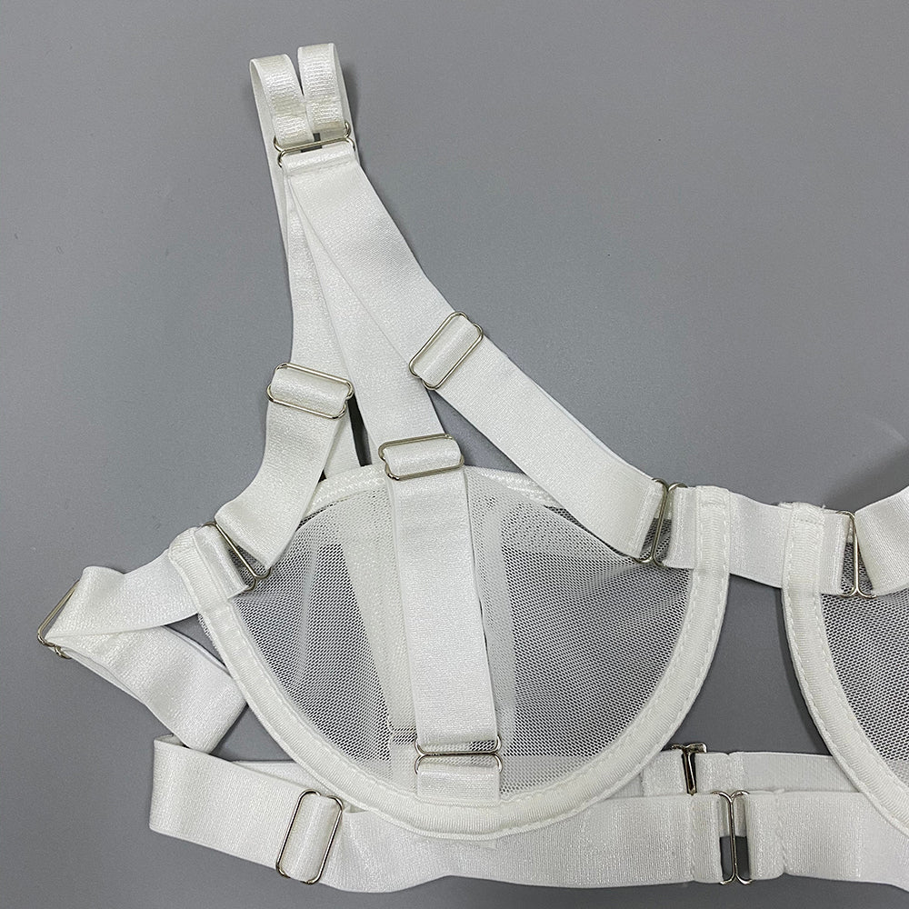 If you like sexy and edgy lingerie, then this set is for you. Made of see-through white polyester, the solid strap design is complete with a collar and garter belt. Designed to make you feel confident and sexy, this set is sure to complement any outfit. The underwired cup design is perfect for all-day wear.