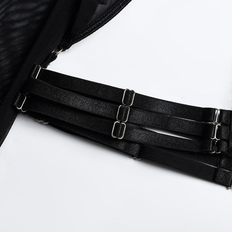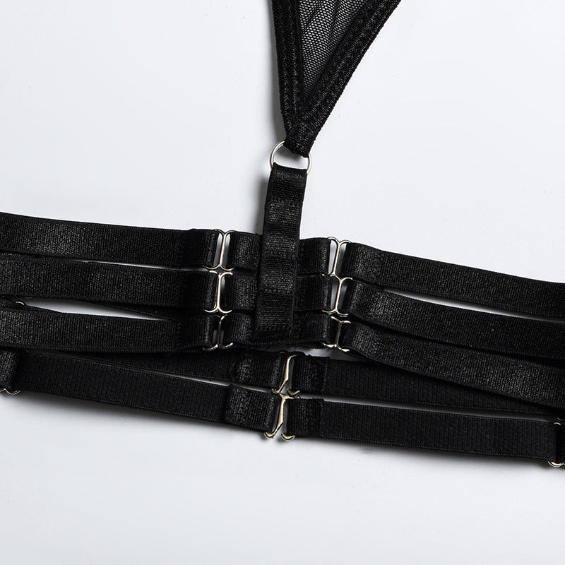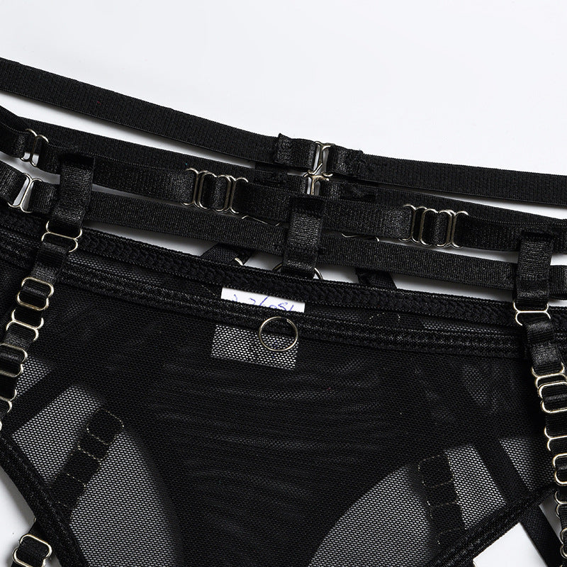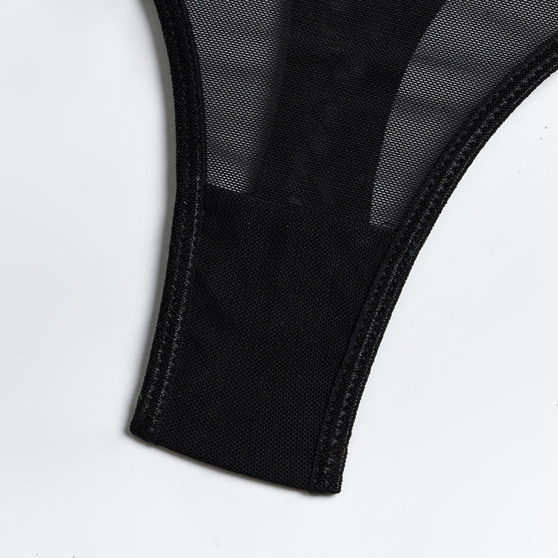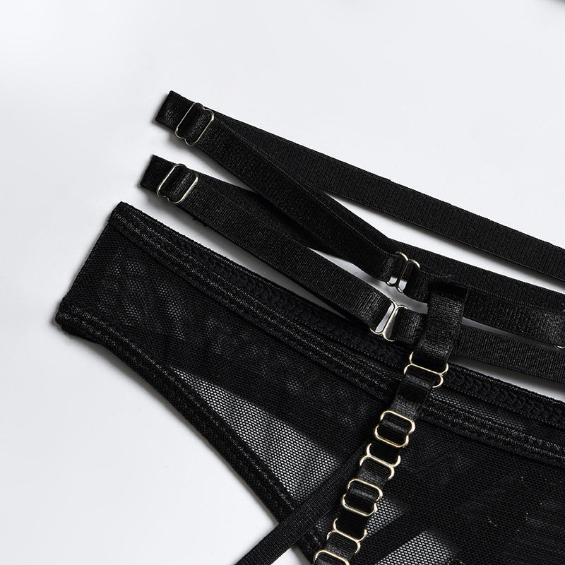 The perfect combination of sexy and sweet, this lingerie set features a white lace bra with black trim and a matching thong. The set is designed with a net cloth, so it is comfortable and breathable. It also features a hollow-out design that reveals the wearer's skin and is finished in a black color.