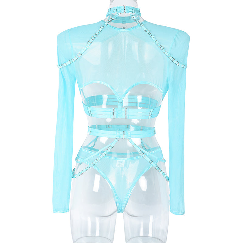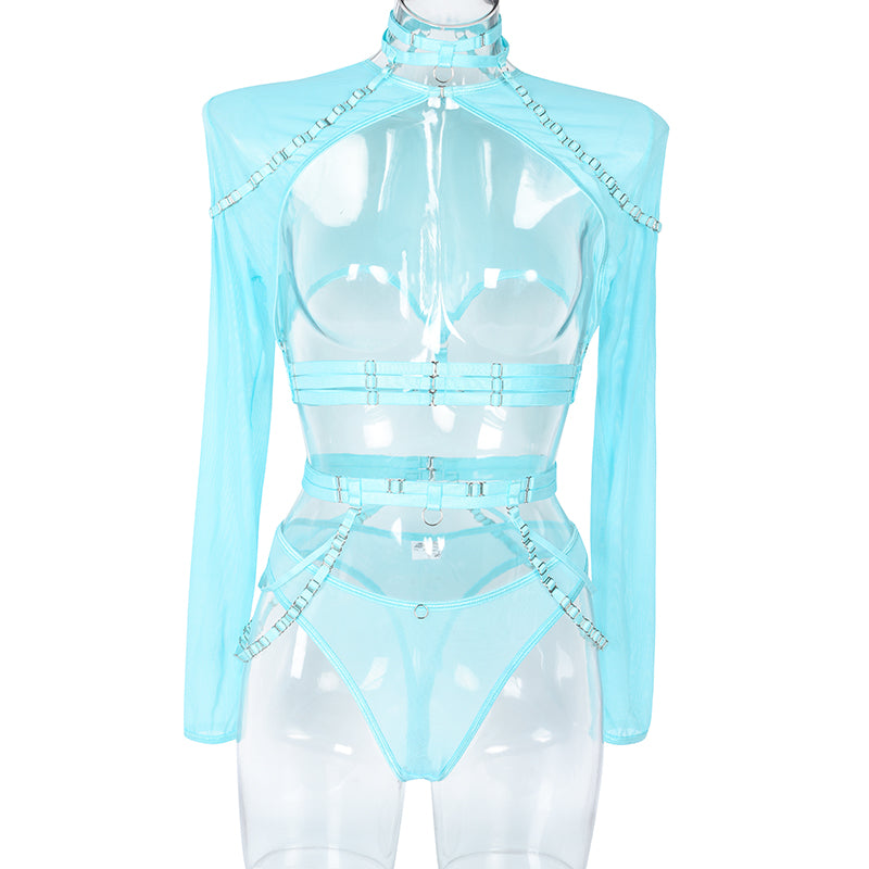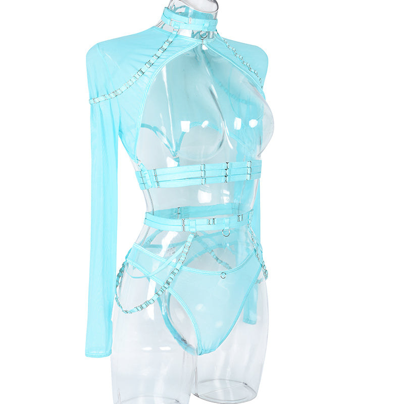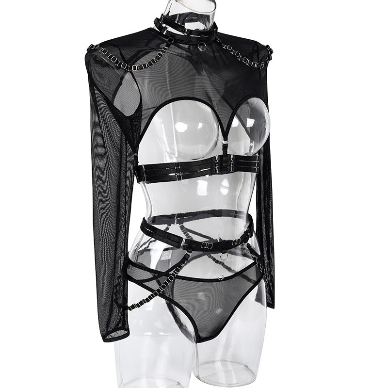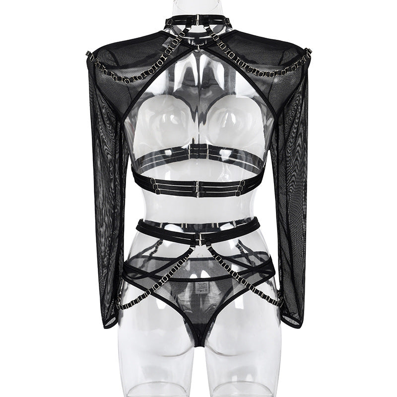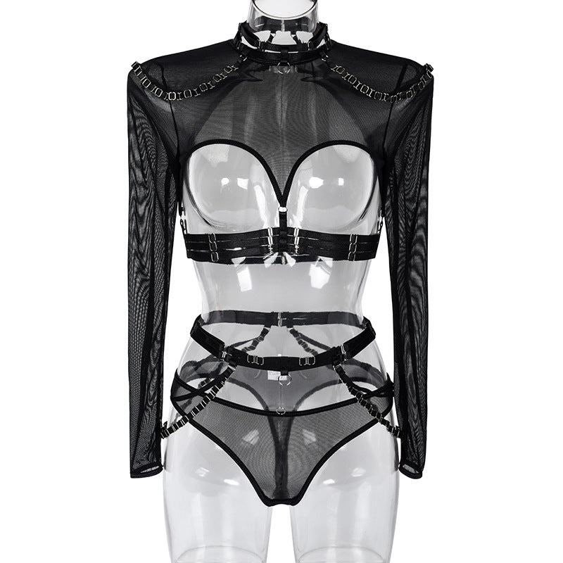 The perfect combination of sexy and sweet, this lingerie set features a white lace bra with black trim and a matching thong. The set is designed with a net cloth, so it is comfortable and breathable. It also features a hollow-out design that reveals the wearer's skin and is finished in a black color.