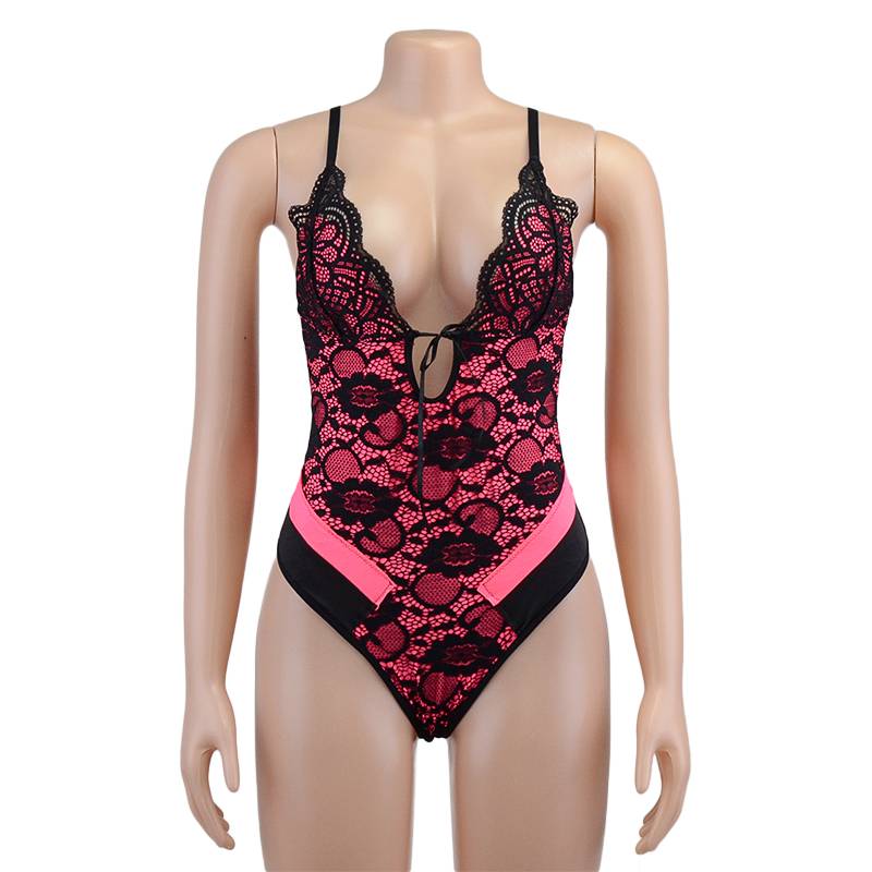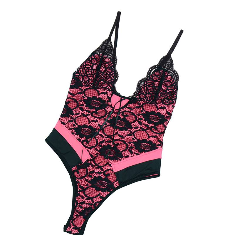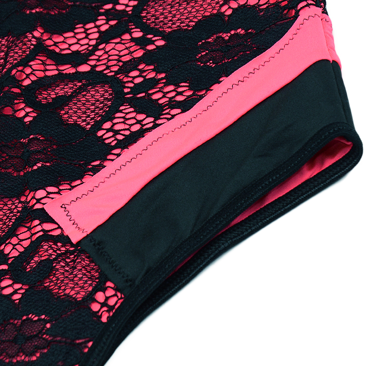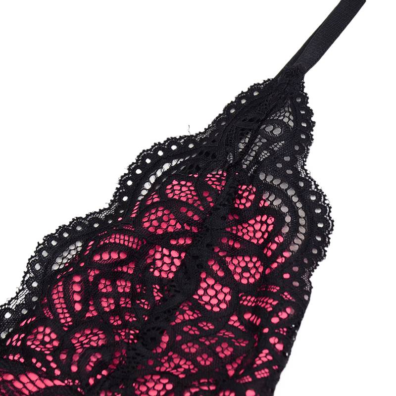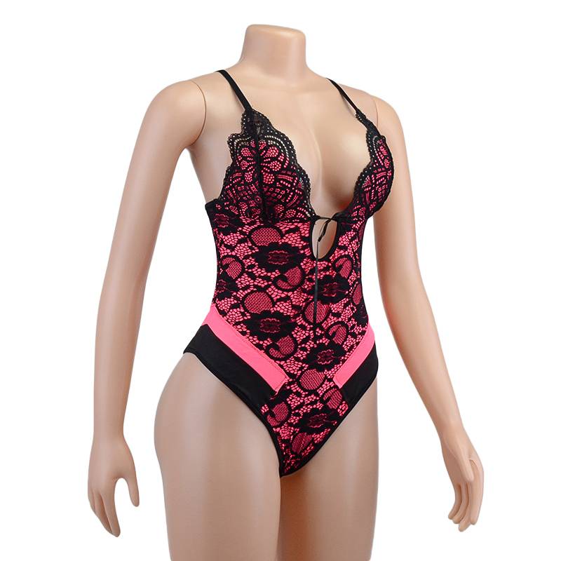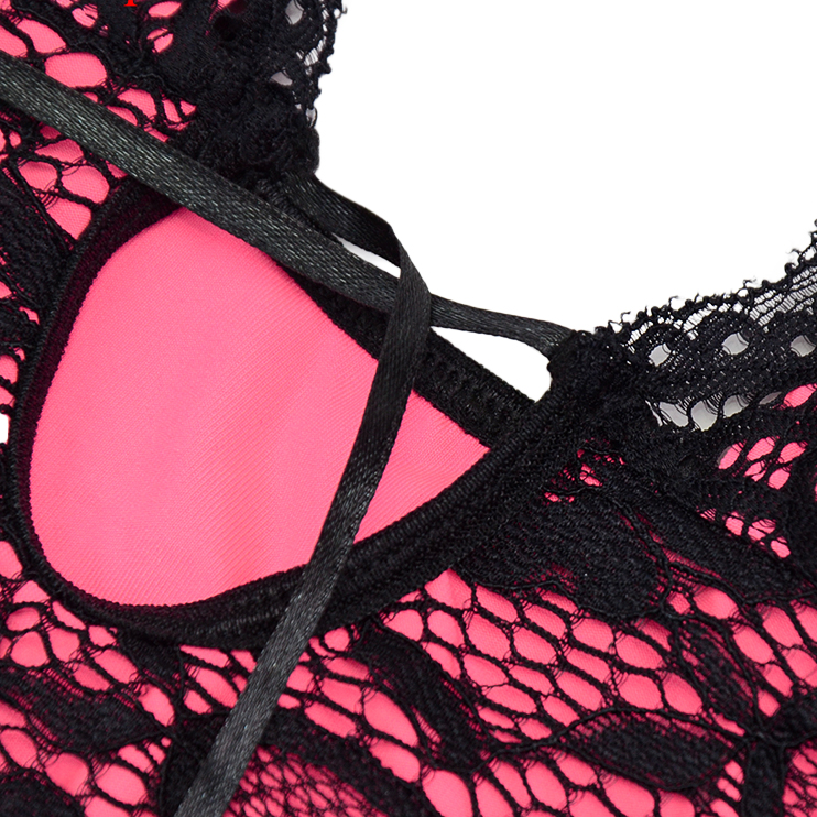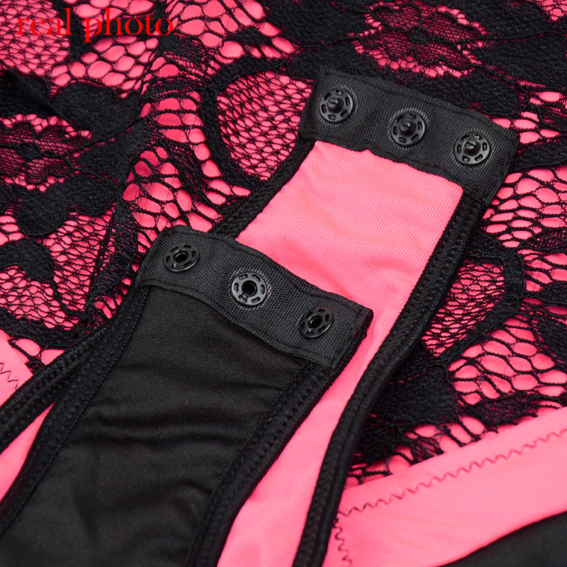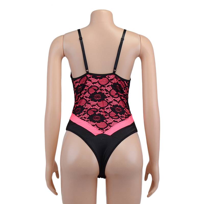 Polyester Teddies In Pink Color with Button Closure at the Bottom and Black Floral Lace Layer Decoration