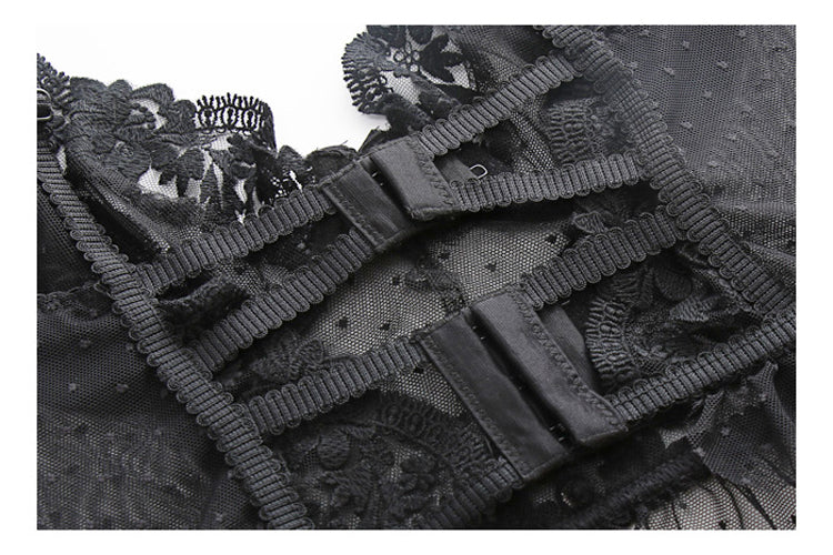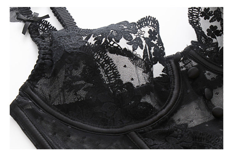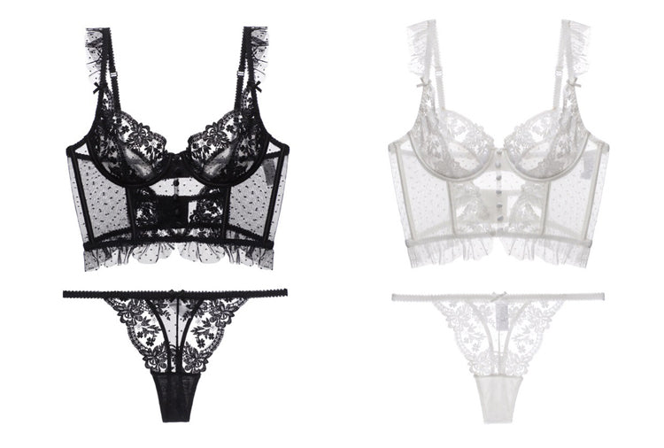 This sheer lace lingerie is a hot fashion trend that is sure to be a hit with any woman. The delicate lace material feels wonderful against your skin. These sexy bralettes and panties are designed to accentuate a woman's curves to create a stunning look. Add a pair of thigh-high stockings for a seductive and stylish look.
