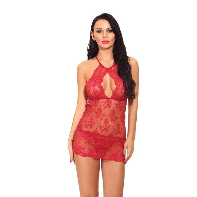 Full See-Through Lingerie with Floral Pattern and Spaghetti Strap