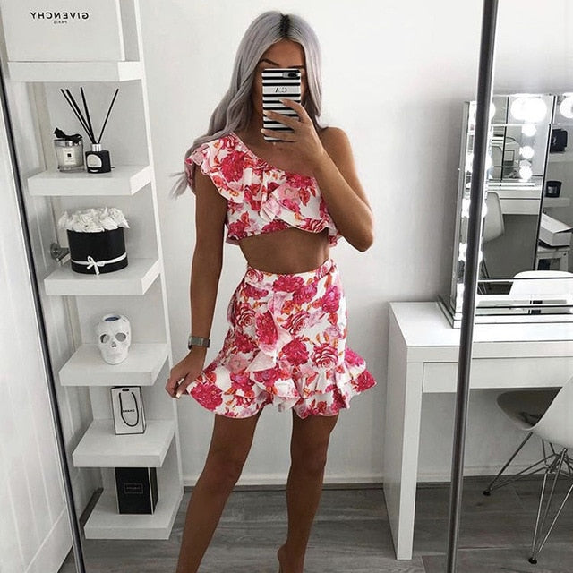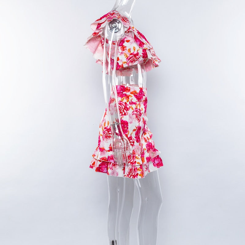 Pink Rose Patterned Skirt Sets with Zipper Closure and Slash Neckline