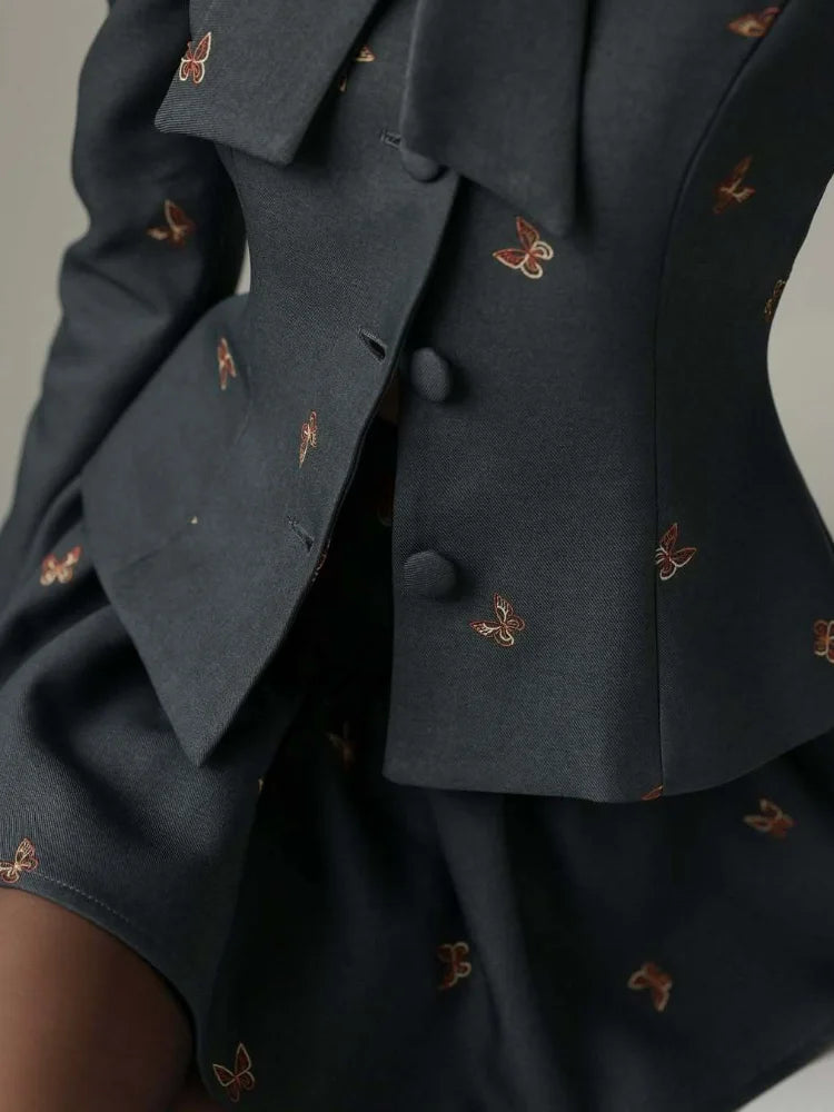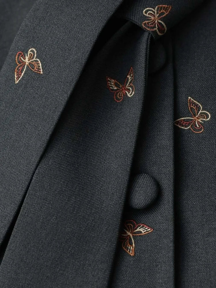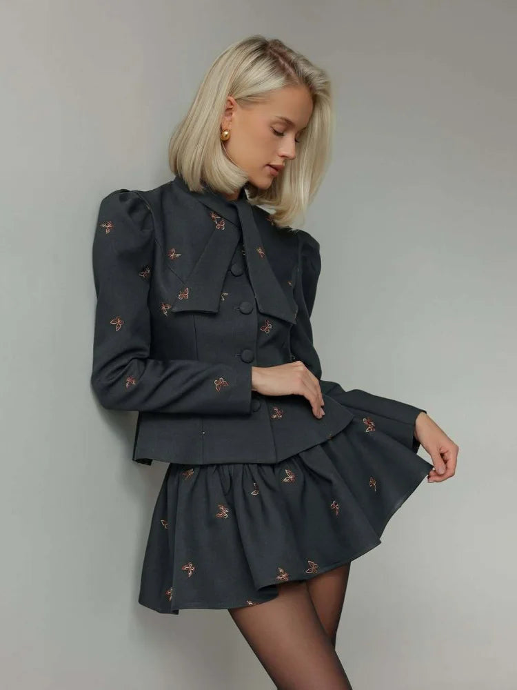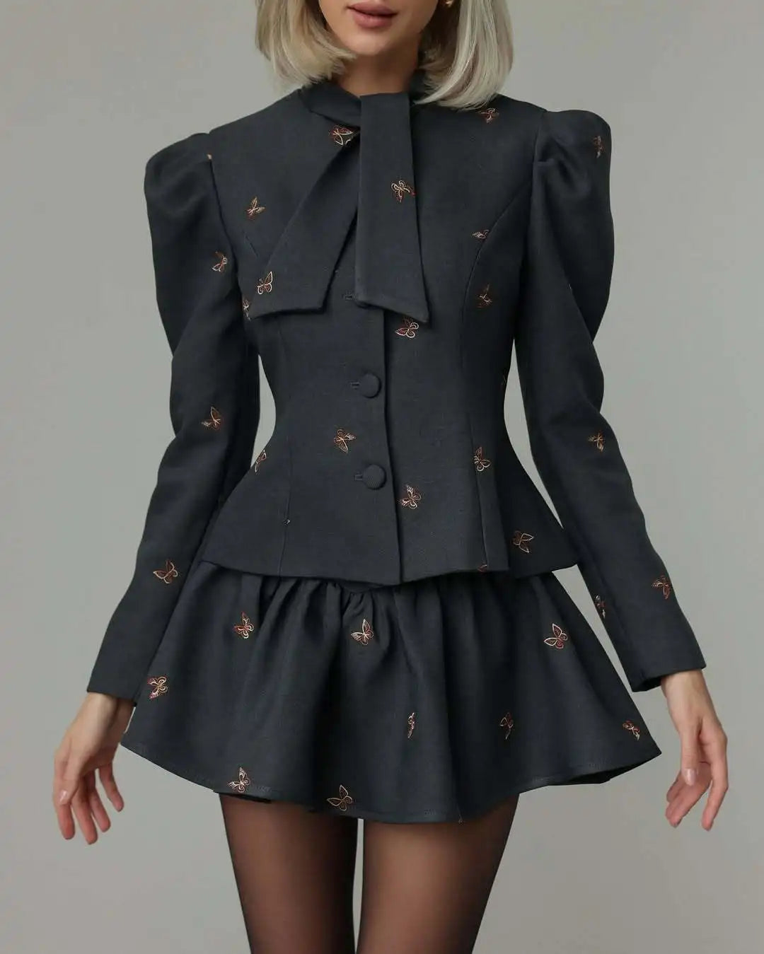 Unleash your boldest style with this daring Bow Tie Neck Puff Sleeve Skirt Set. Crafted from smooth polyester, it features an eye-catching butterfly embroidery that transforms this piece into a statement-making ensemble. The dramatic puff sleeves command attention while the elegant bow tie neckline adds a touch of sophisticated edge. Perfect for those ready to turn heads and break fashion rules with confidence.