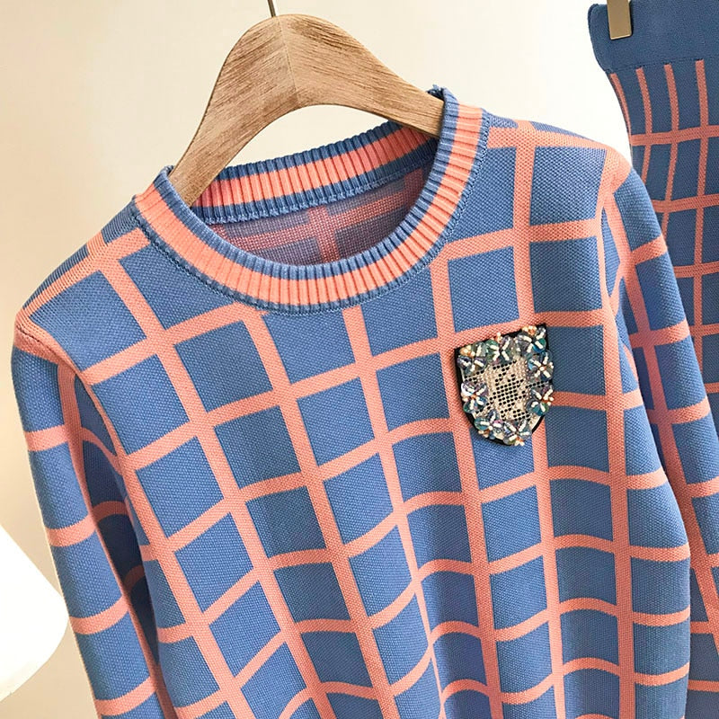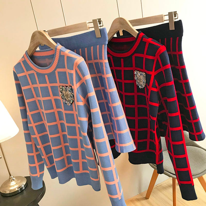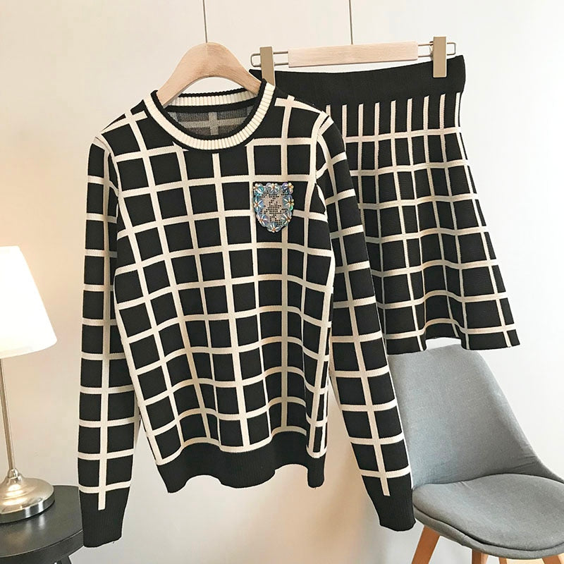 Stylish, versatile, and perfect for any occasion, this skirt set is the perfect addition to any wardrobe. The long sleeve sweater and mini skirt set is available in three colors and have a pleated skirt and elastic waist. The skirt set is made of cotton and is knitted. It has a patch decoration on top and a very trendy look.
