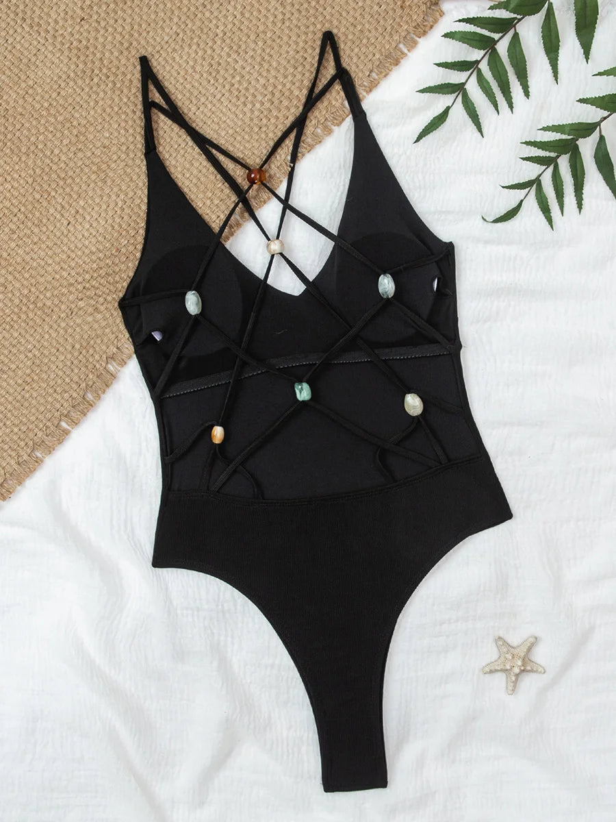 Wrinkled Pearl Beads Halter One Piece
