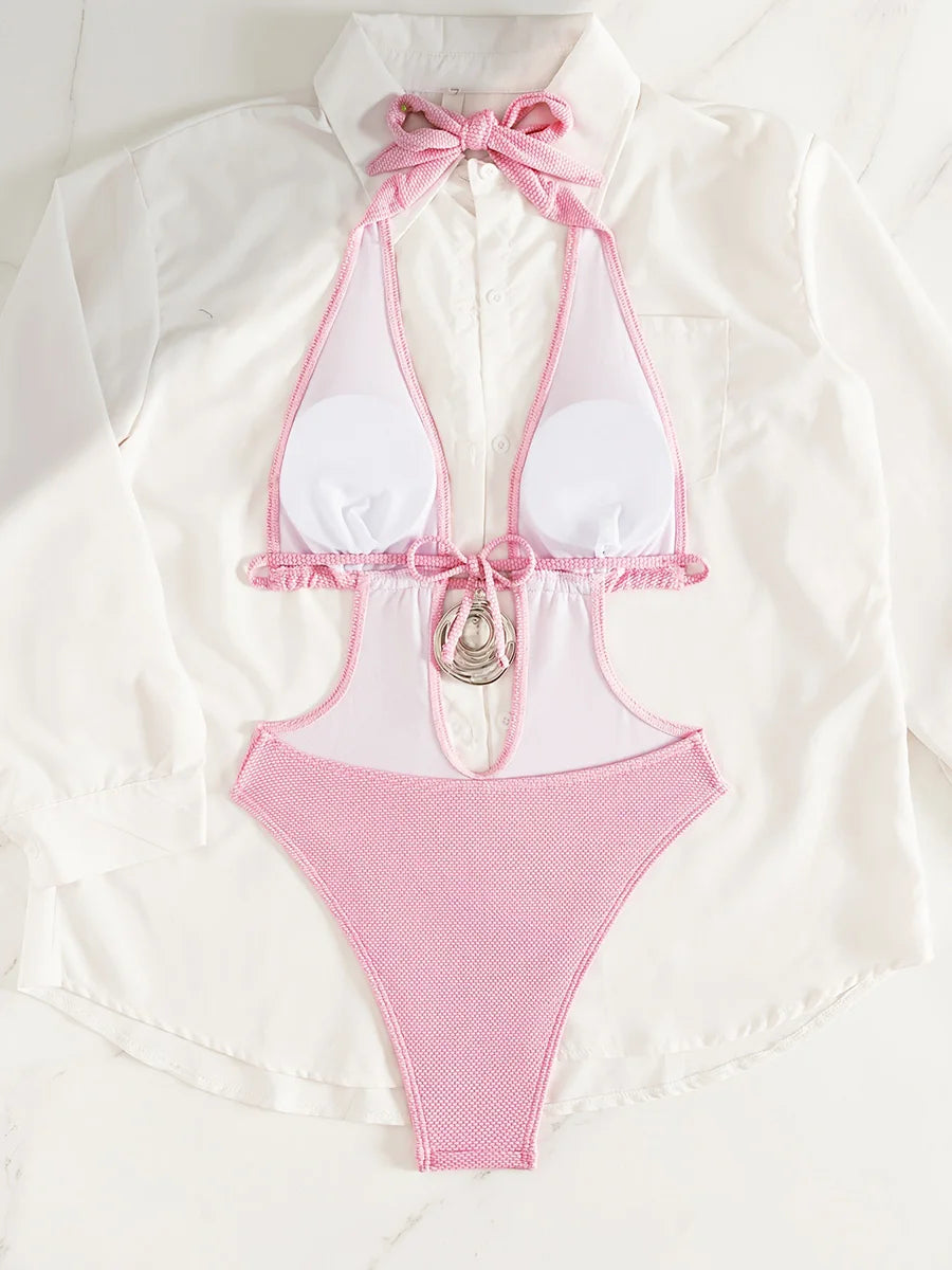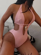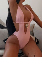 Make a bold statement in this striking pink monokini featuring a flattering halter neckline and daring deep V-cut design. The sleek one-piece silhouette offers modern elegance with a touch of confidence, perfect for poolside moments or beach getaways. The halter straps provide secure support while the plunging neckline creates an eye-catching focal point. Crafted for comfort and style, this piece transitions seamlessly from sun to evening wear.