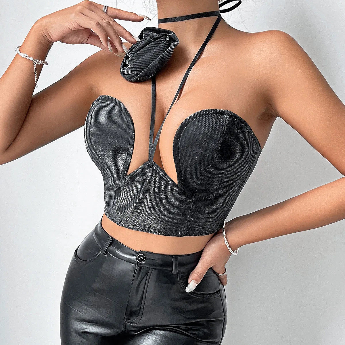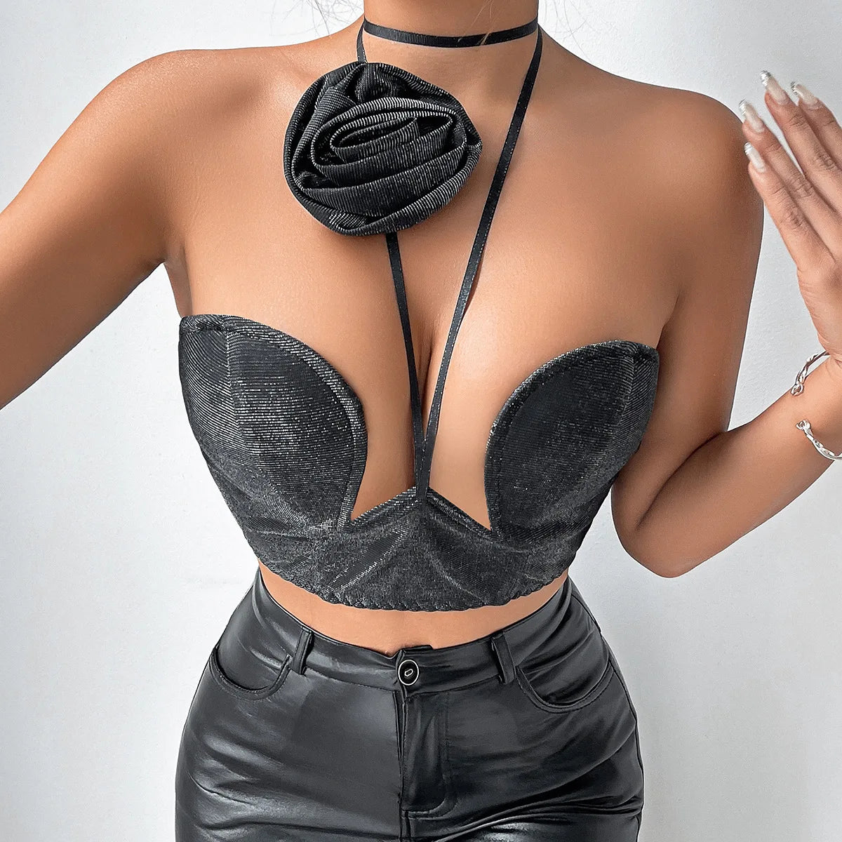 Transform into a sexy goddess with our Talked For A Sec Crop Top! Made with a luxurious blend of polyester and spandex, this top features a striking 3D rose decoration and intricate hollow out detailing. Show off your unique style and charm with this solid patterned top.