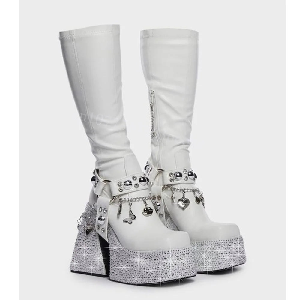 Experience the ultimate in comfort and style with The Light In Me Mid-Calf Boots. These boots boast a charming solid pattern and are adorned with beautiful rhinestones and charming charms. Elevate your wardrobe with these must-have boots today!