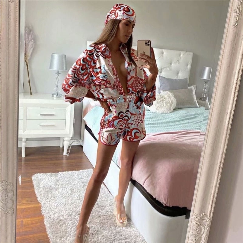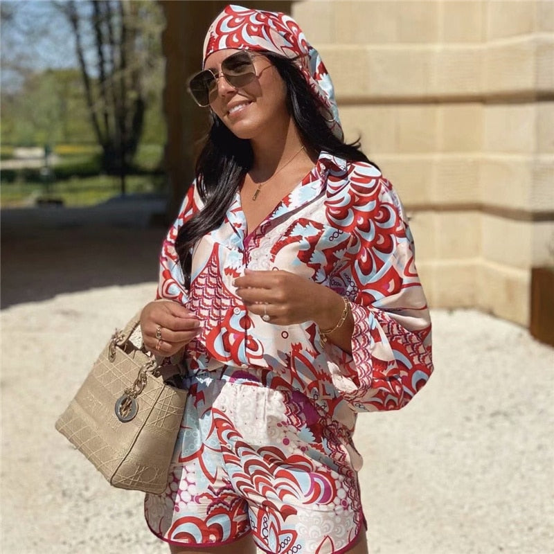 Floral Patterned Shirt, Headscarf, Shorts, and Pant with Polyester Material