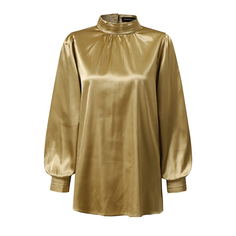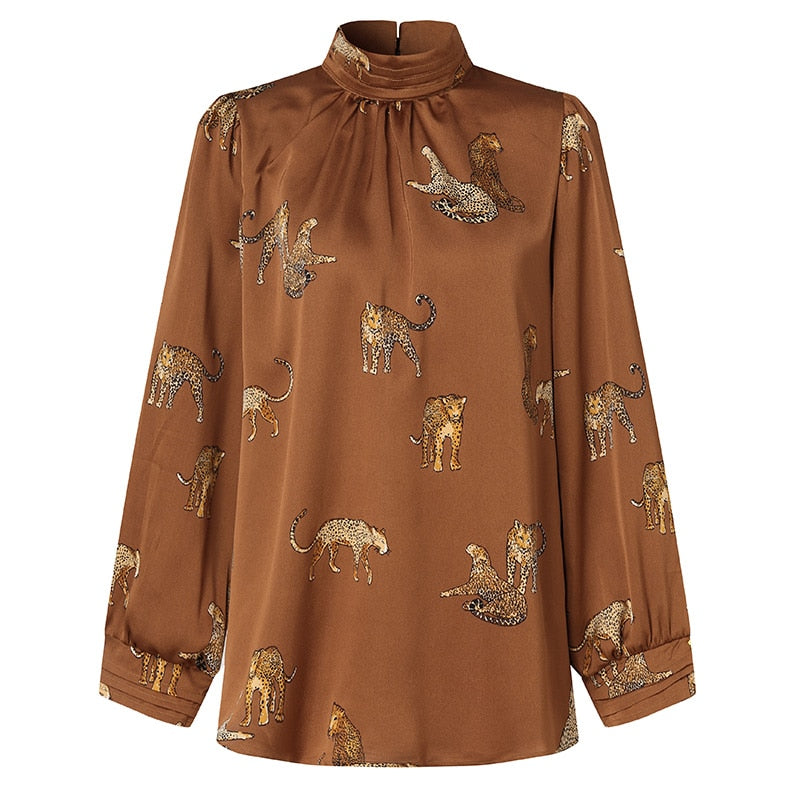 This blouse has 2 styles. Solid color and the other style has a leopard print pattern. The long lantern sleeves and the turtleneck collar give a comfortable and stylish look at the same time.