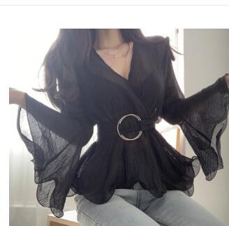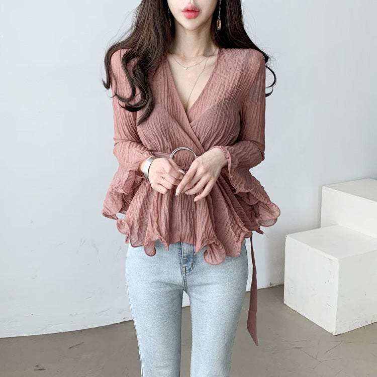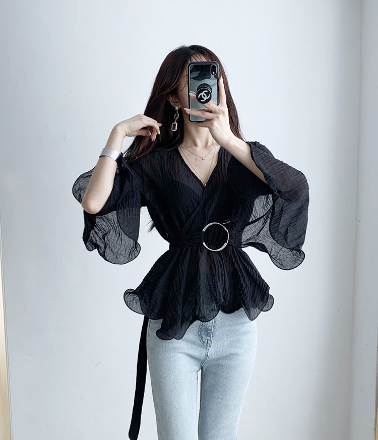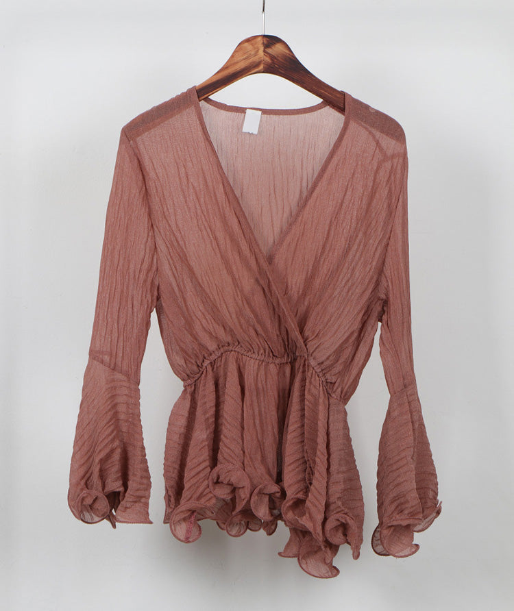 V-Neck See-Through Blouse with Flare Sleeve and Chiffon Material