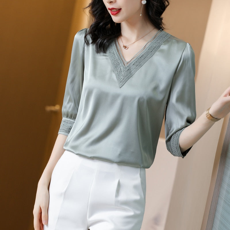 Solid Half-Sleeved Lyca Silk Spandex Blouse with Lace Trimmings