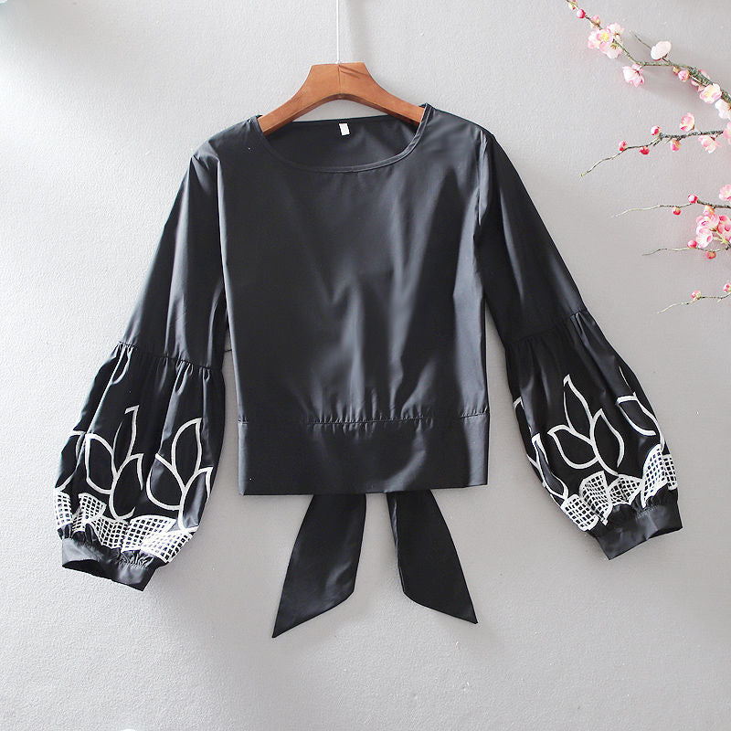 Lantern Sleeved Polyester Blouse with Floral Printed and Ribbon Decoration