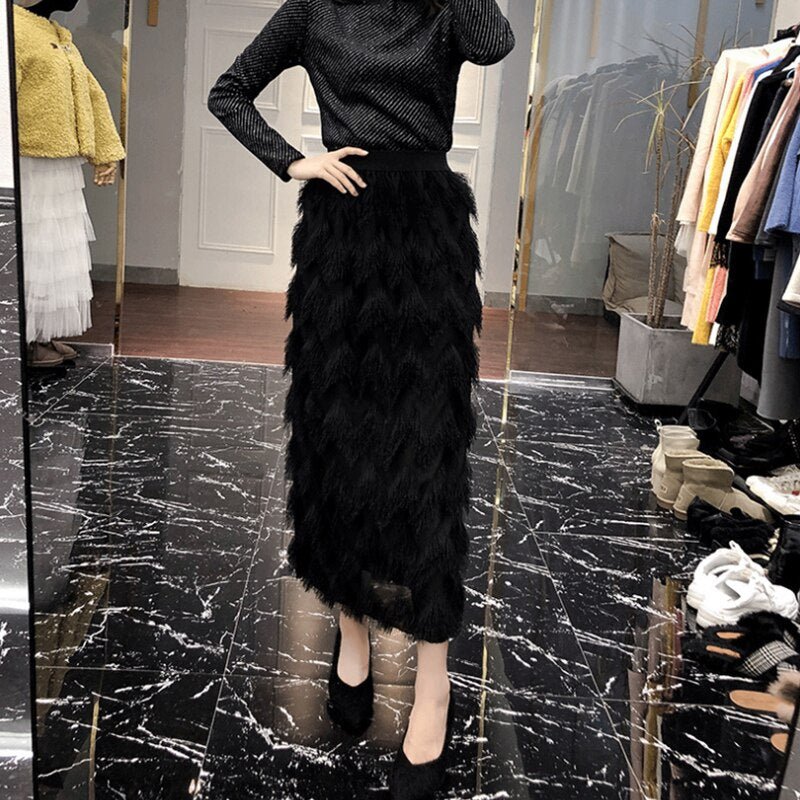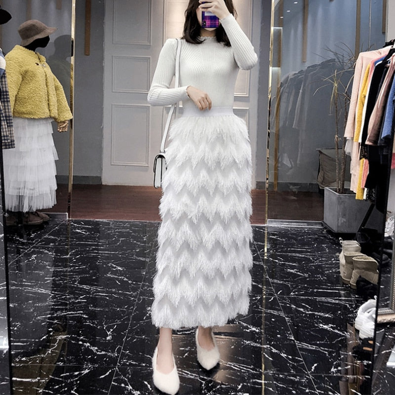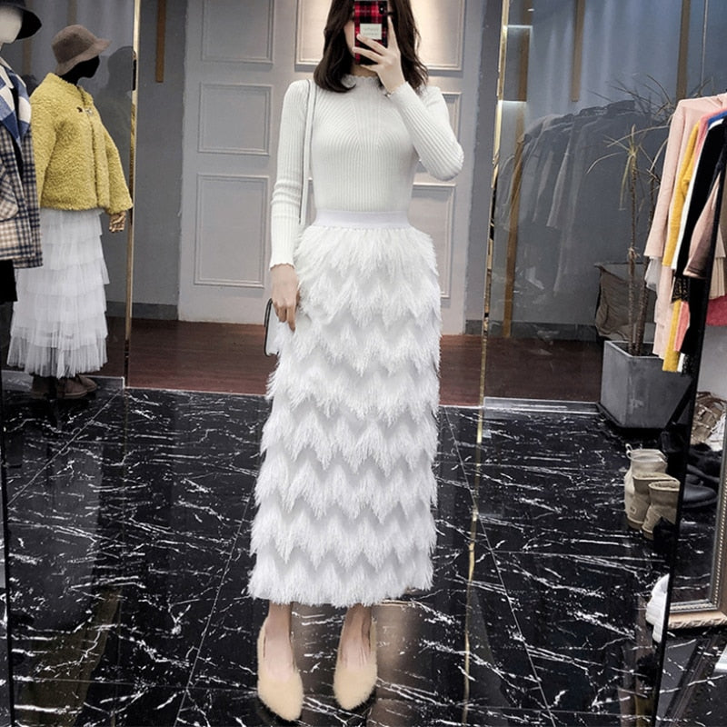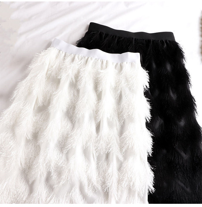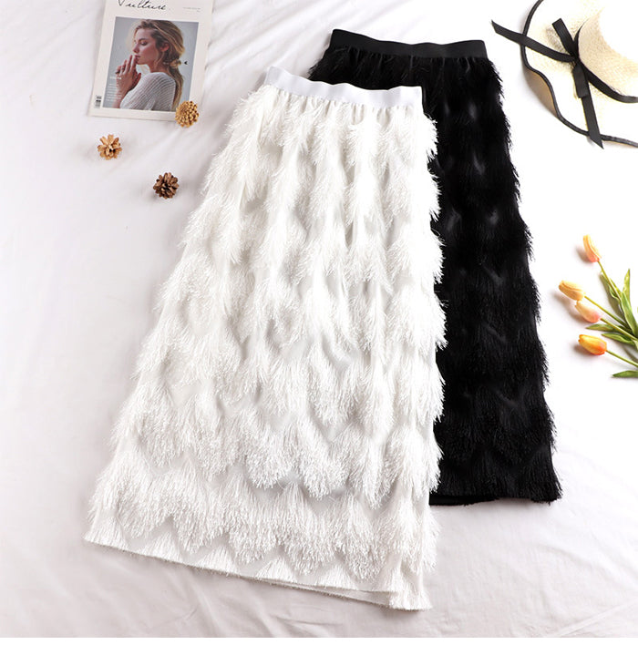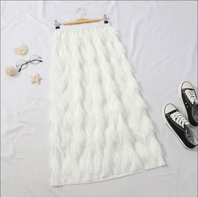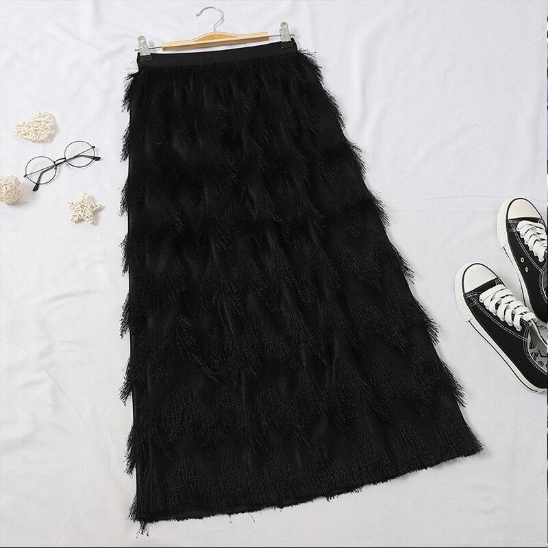 Polyester Mid-Calf Skirt with Elastic Empire High Waist and Decorated with Tassels