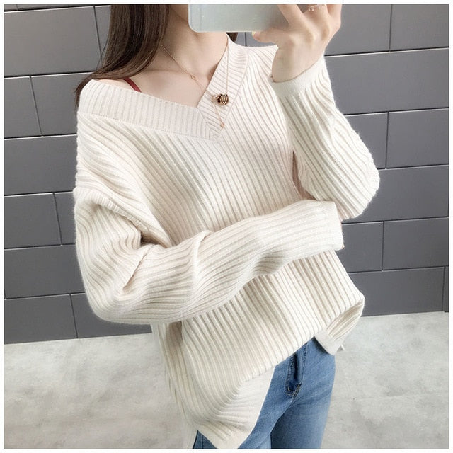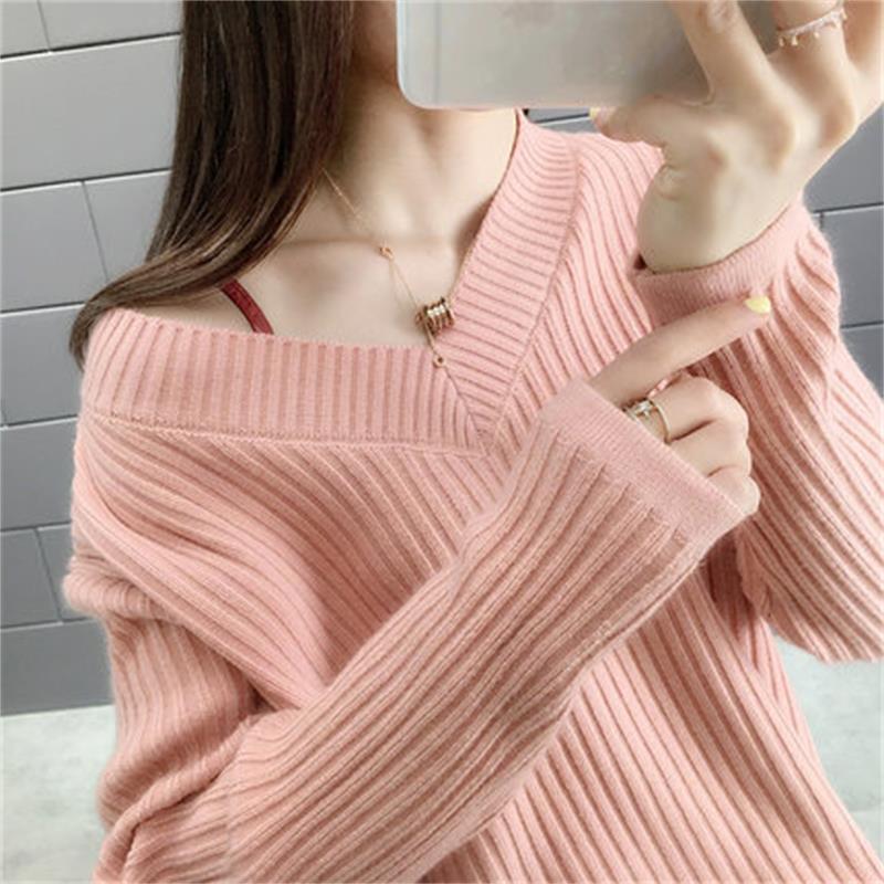 V-Neck Collar Sweater With Solid Pattern, Knitted Fabric Type, Long Sleeve, And Polyester Material