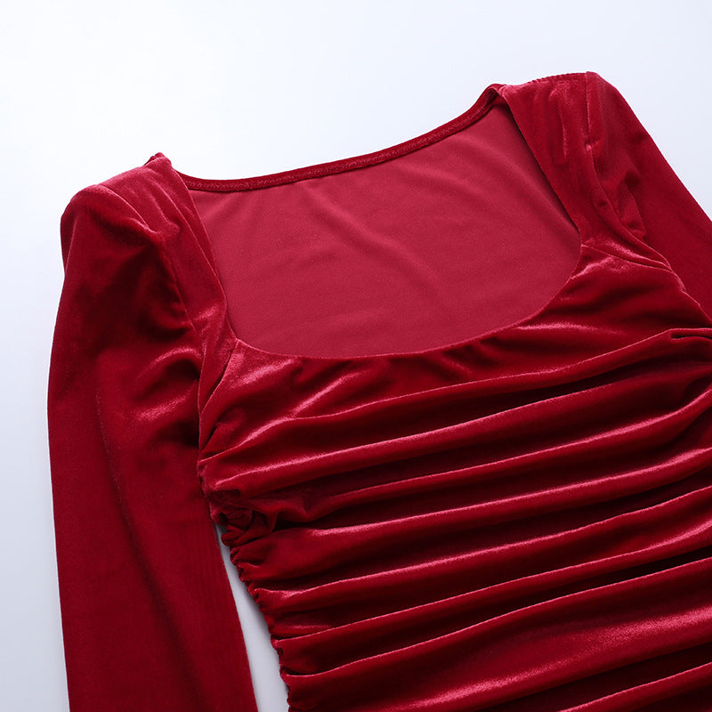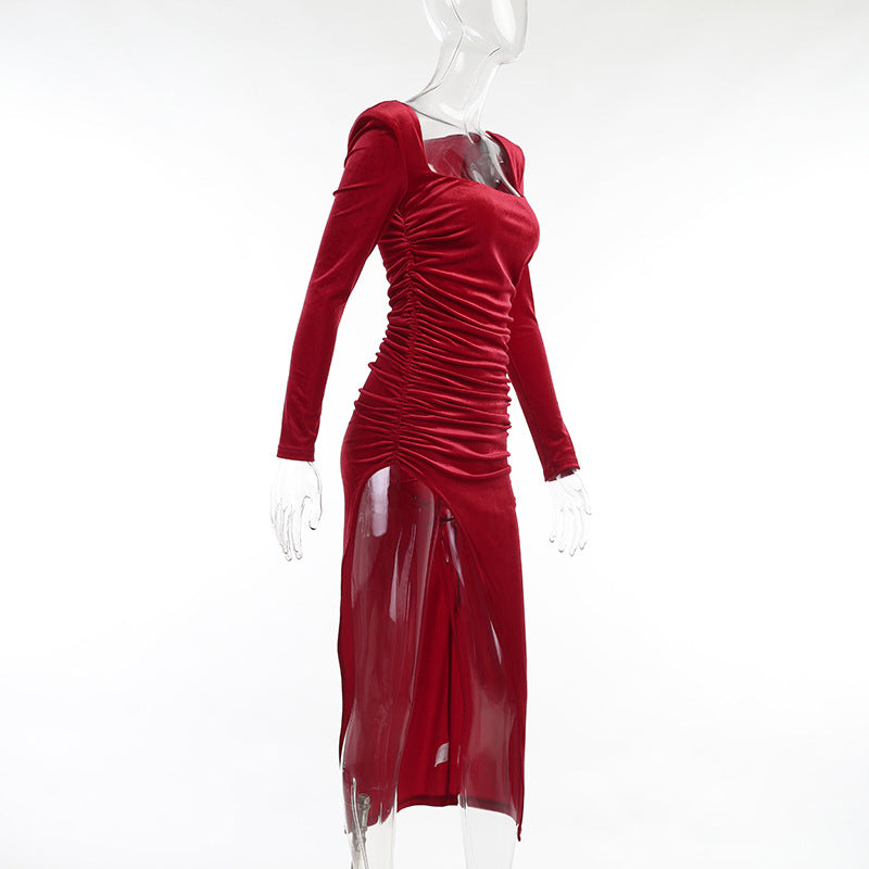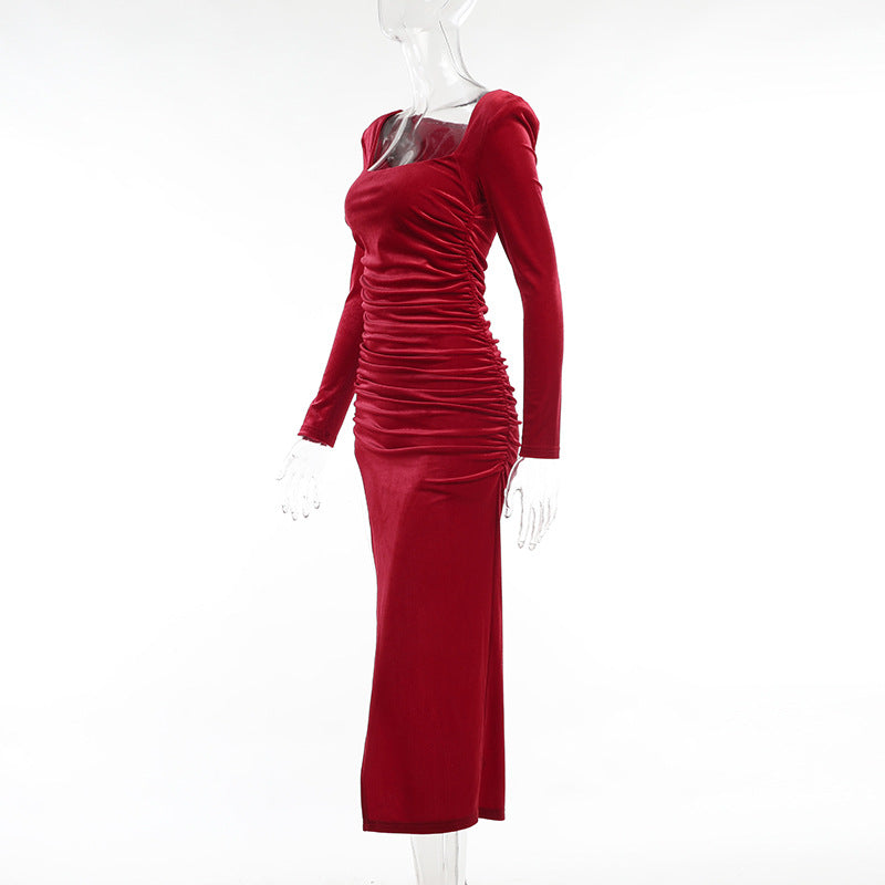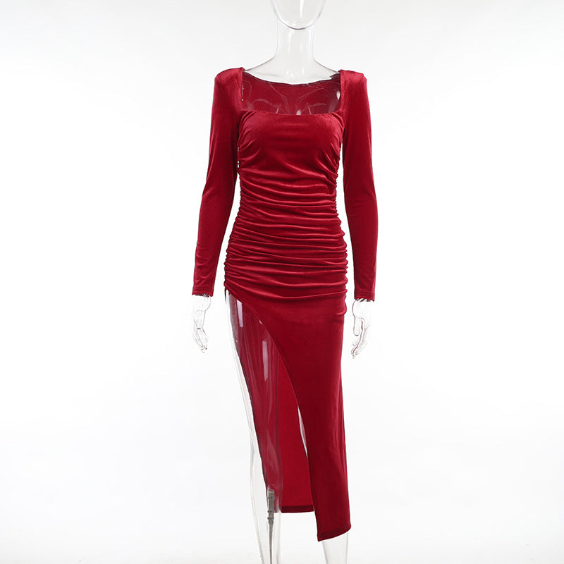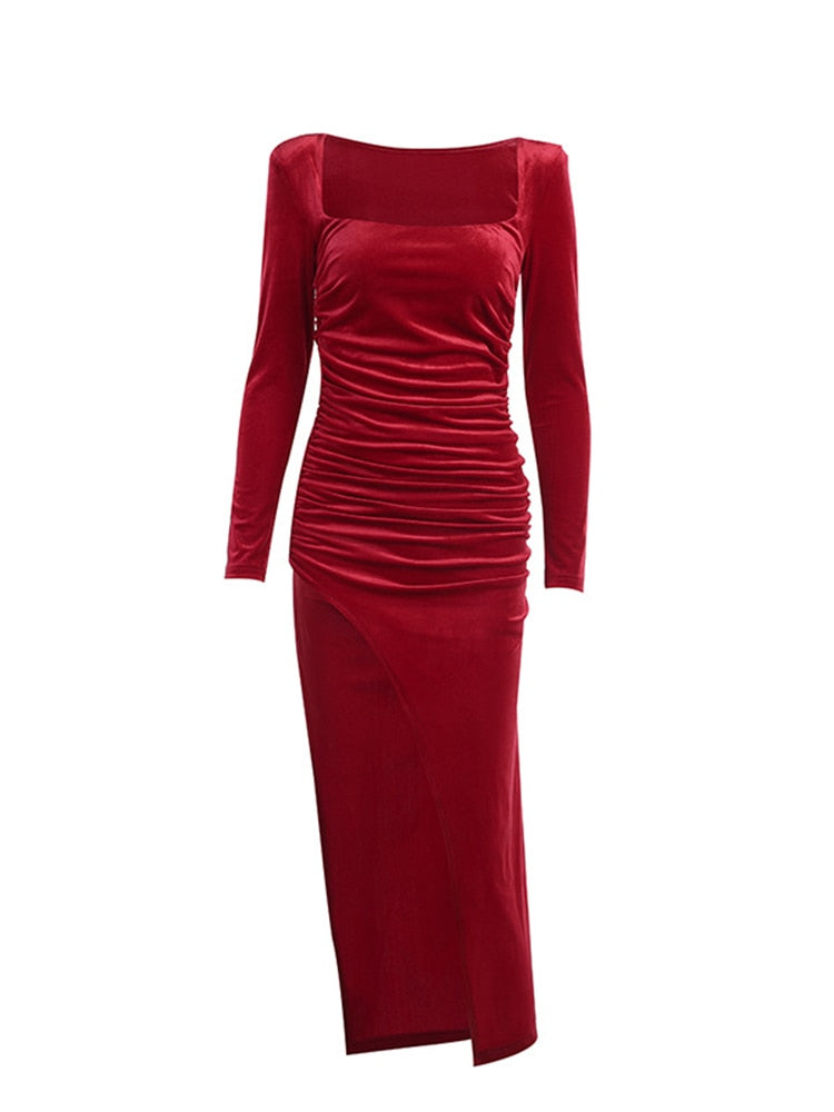 This dress is crafted from a soft cotton velvet material. A chic and stylish mid-calf dress that can be dressed up or down depending on your style. The classic square neckline style is a versatile choice that looks fantastic. The side ruched with the high slit gives this dress a feminine touch that is sure to get noticed.