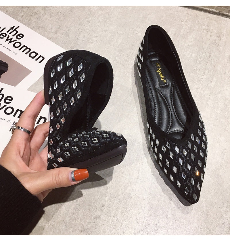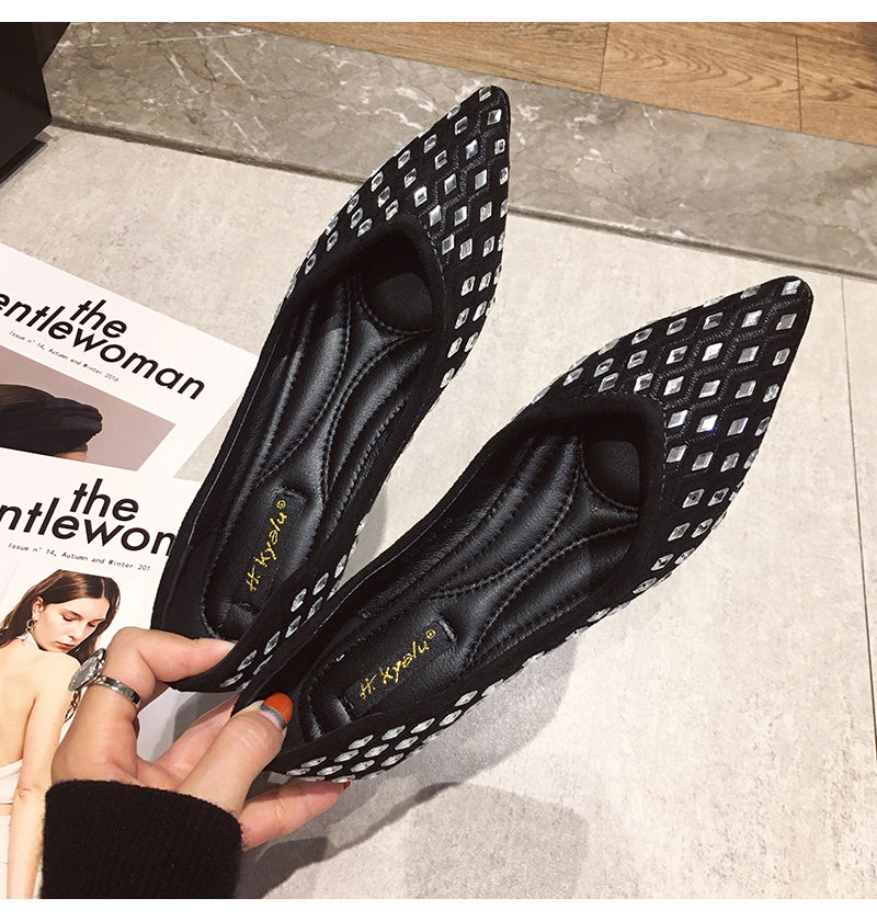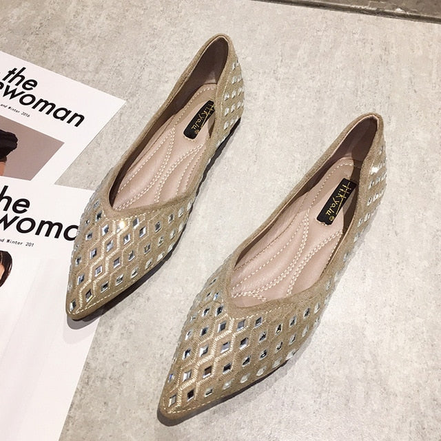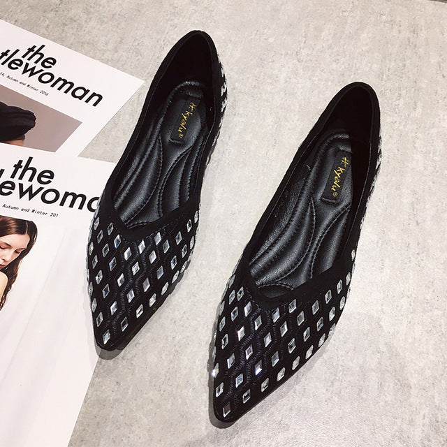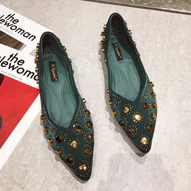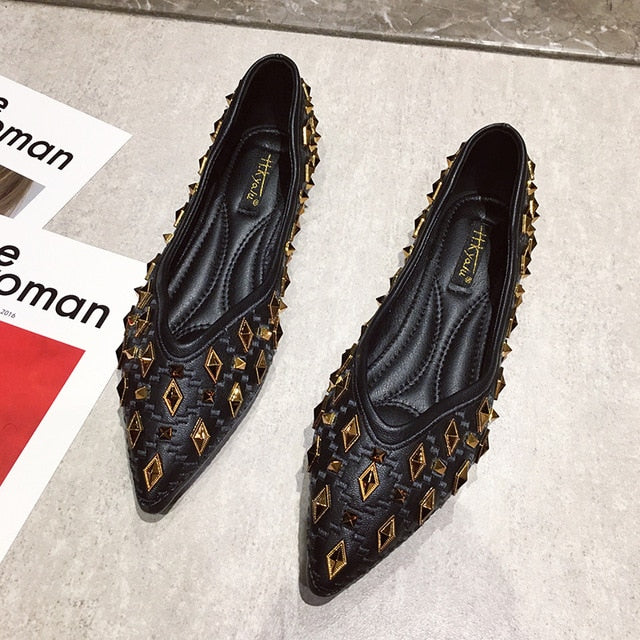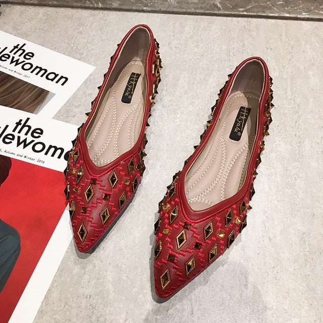 Spring Red Stud Embroidered Pointed Toe Women Flat Shoes