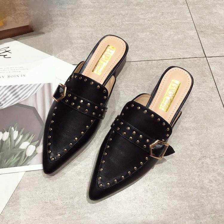 Low-Heeled Pointed Toe Studded PU Leather Mules with Buckle Decoration