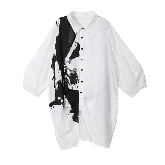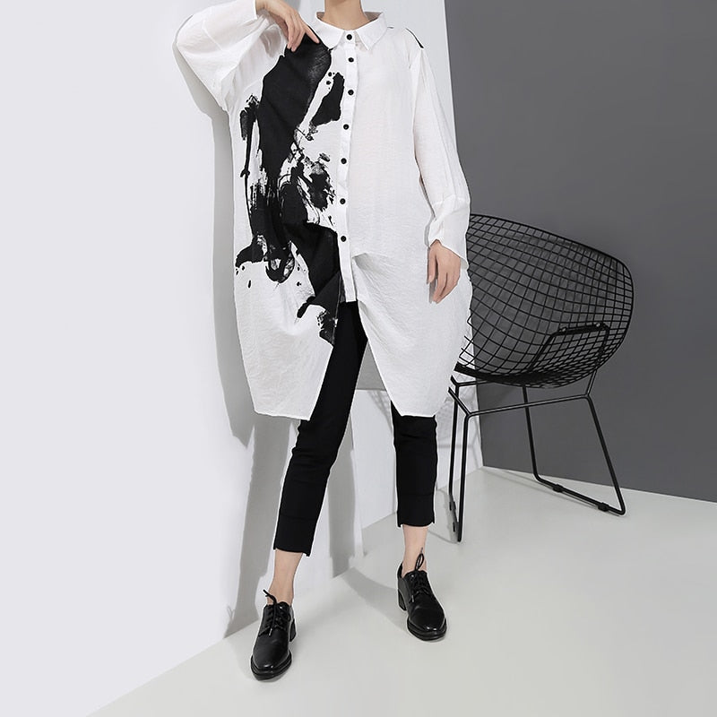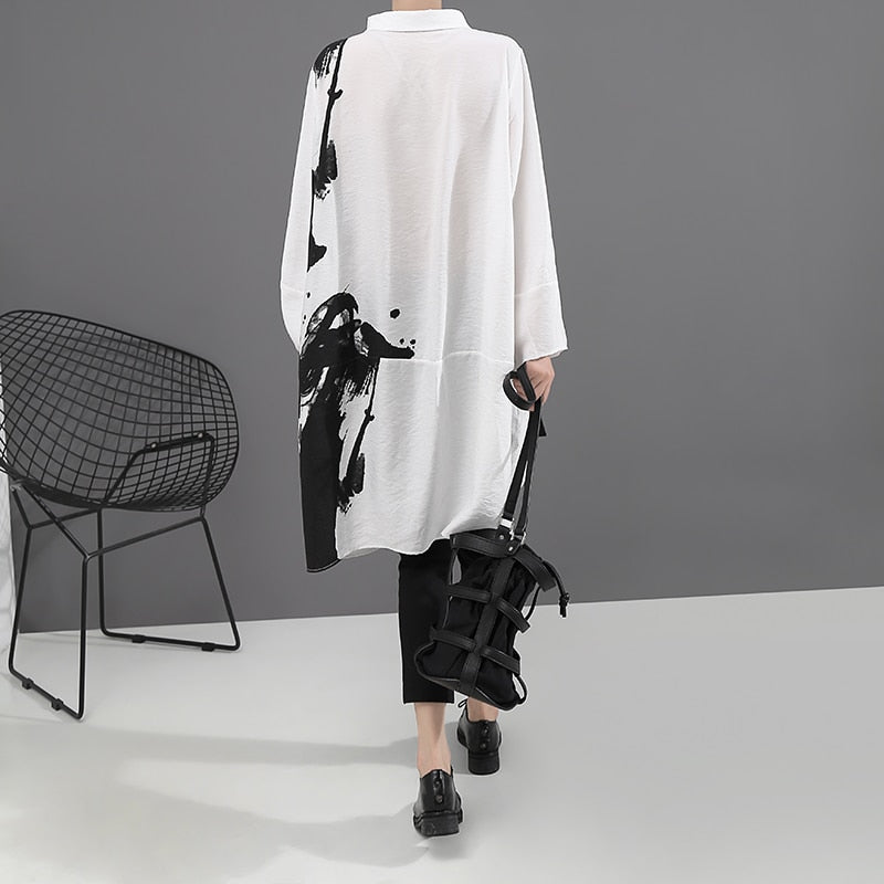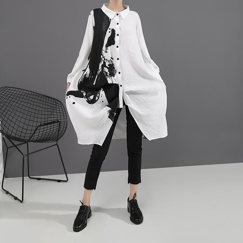 Long Loose Shirt with Turn Down Collar, Abstract Print Pattern, Single Breasted Closure, and Cotton Rayon Material