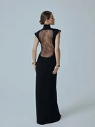 Make an unforgettable entrance in this provocative maxi dress that flaunts intricate see-through lace detailing across the back. A daring design that reveals just enough to captivate, this piece transforms you into the most intriguing person in the room. The flowing silhouette commands presence while the delicate lace creates an irresistible contrast between mystery and allure. For those bold enough to embrace their power.