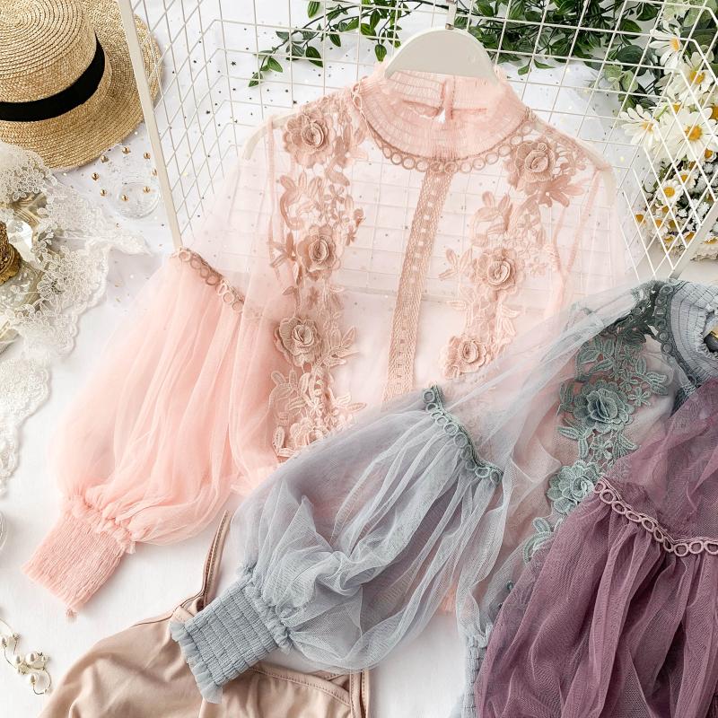 Long Lantern Sleeve See-Through Blouse with Flower Applique