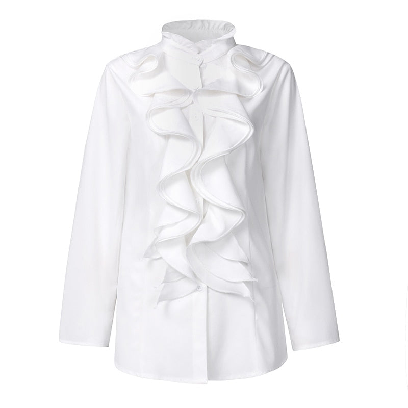 Join the trend and masquerade in style with this dazzling ruffled shirt. This elegant piece shows off a trendy ruffled design in black or white. The feminine colors correspond with so many other accessories and outfits. The classic, ladylike style of this top is sure to have you looking like a million bucks. Look and feel your best with this impressive and stylish shirt. This ruffled shirt is the perfect way to finish your look.