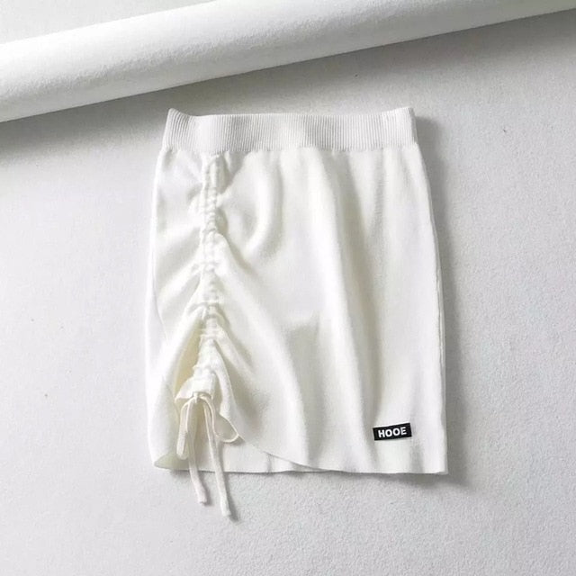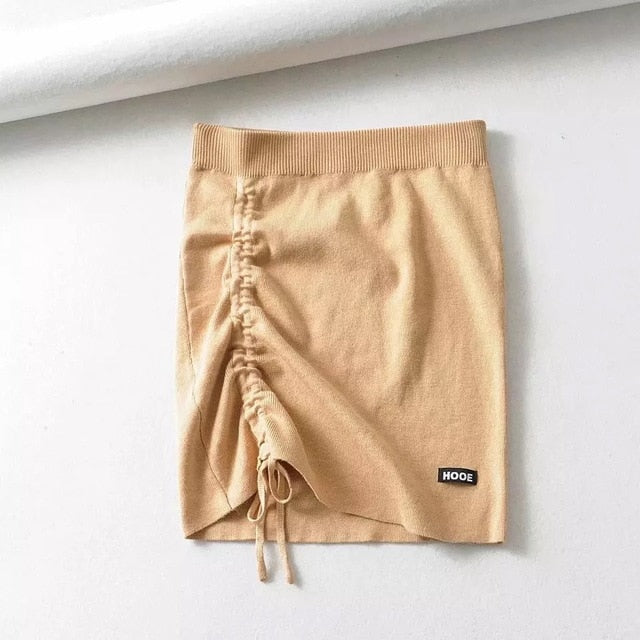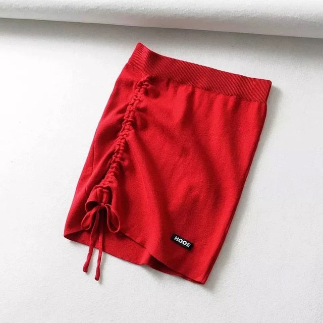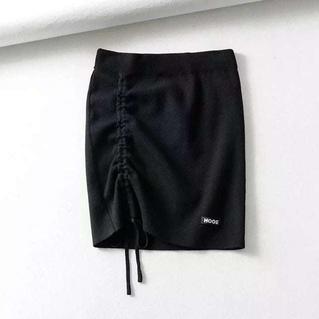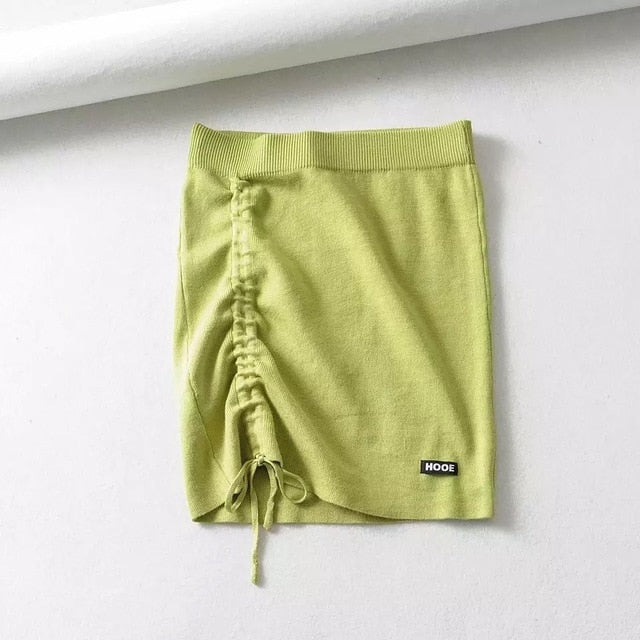 Solid Color Knitted Mini Skirt with Drawstring Decoration and Cotton Spandex Material