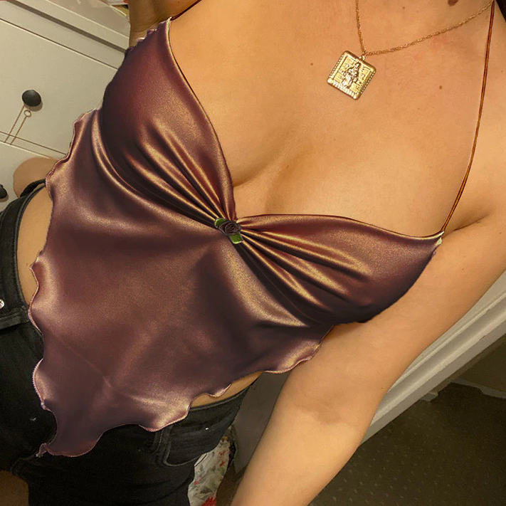Solid Sleeveless Polyester Spandex Satin Camisole Top with Halter Style