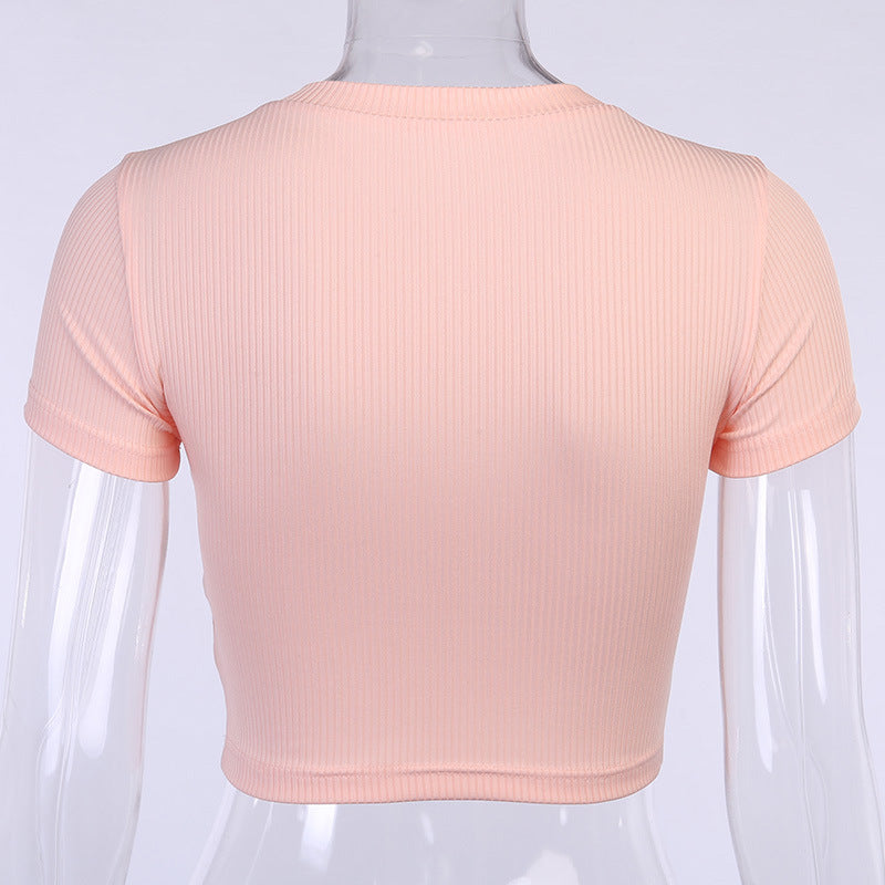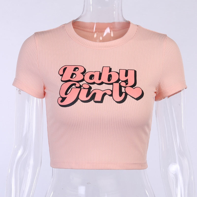 This t-shirt is a cropped top with a letter printed on the front. It is made of cotton and has short sleeves. The t-shirt is available in a pink and white color option.