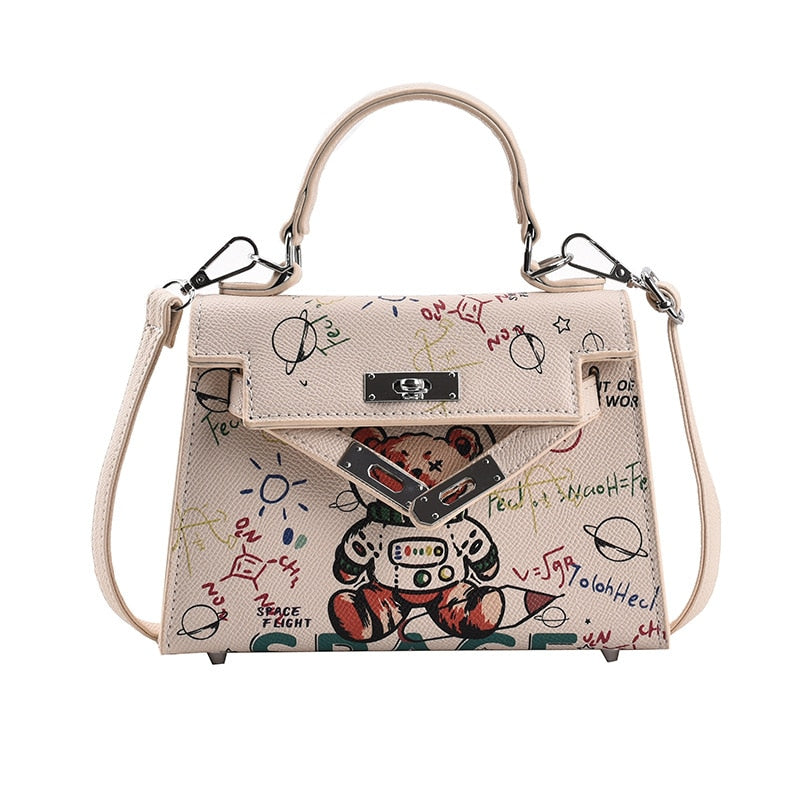 This handbag is made of PU leather. It has a cartoon printed design and a handle. It is cute and trendy. You can use this handbag for daily purpose. It is durable and sturdy.