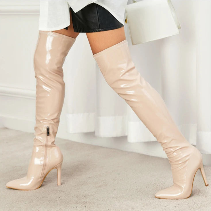 Step out boldly with the Coming From Echoes Over-the-Knee Boots. Featuring a sleek pointed toe and crafted from smooth PU material, these boots command attention and elevate any outfit. Perfect for those who dare to make a statement, they combine edgy style with confident sophistication.