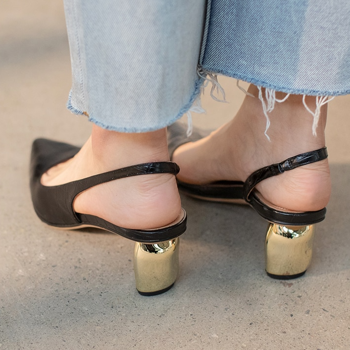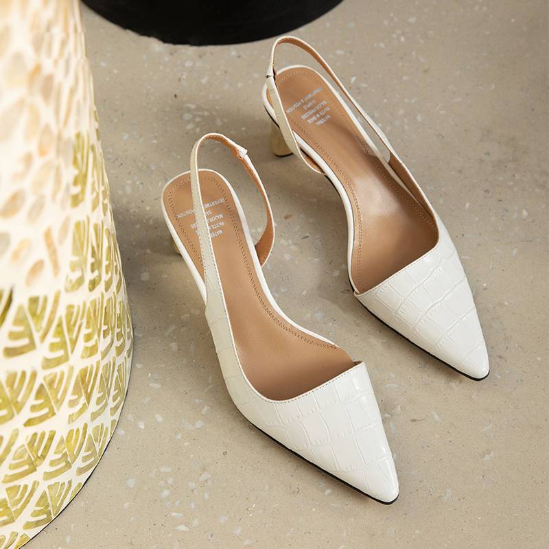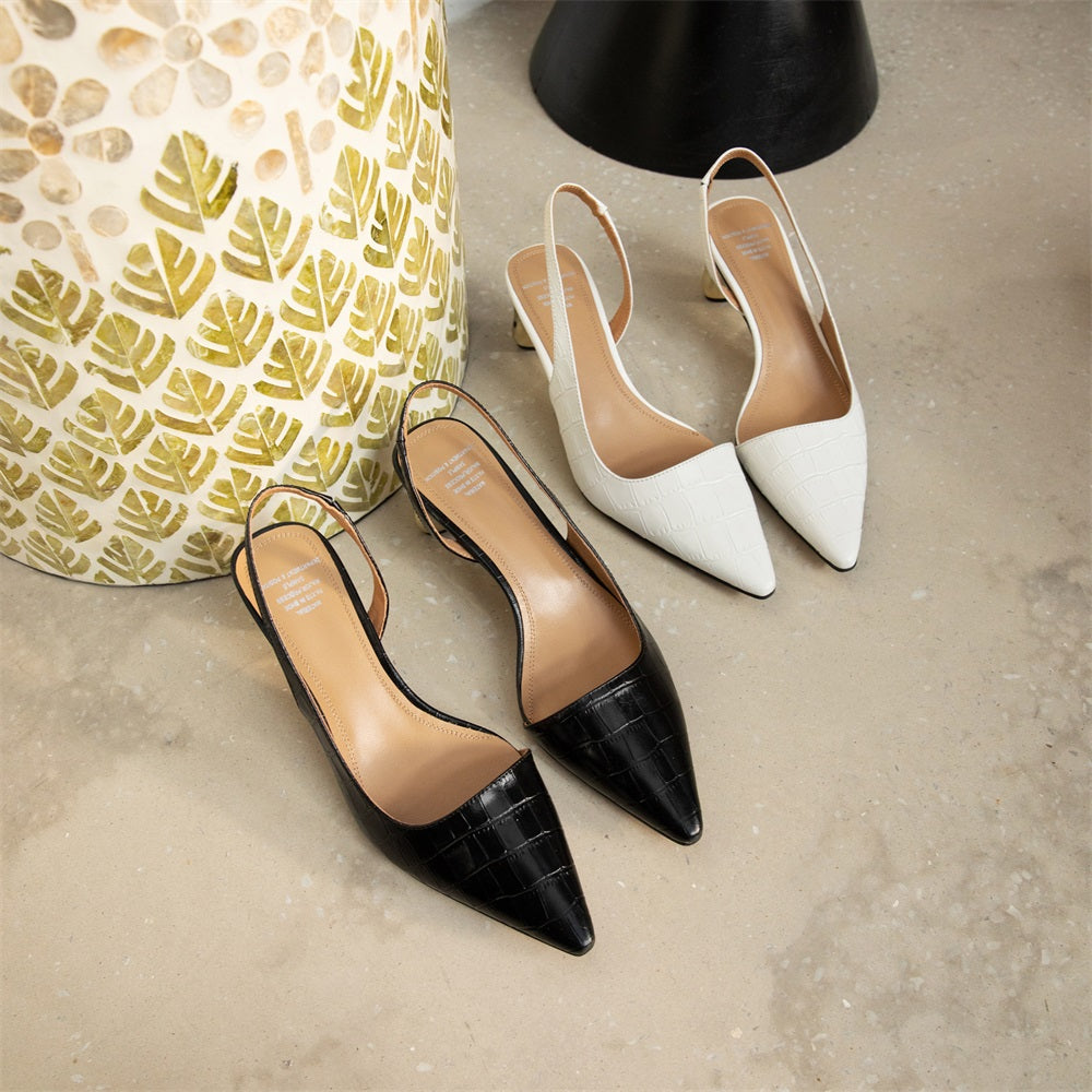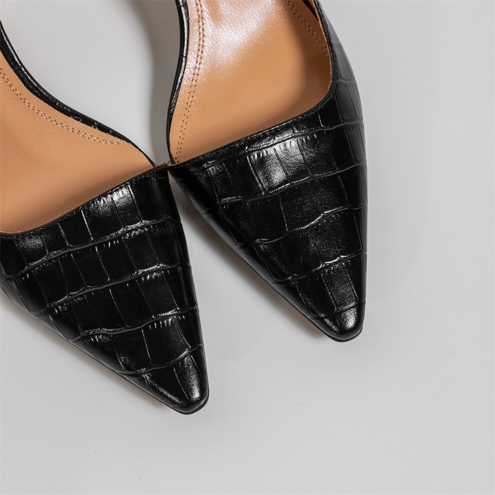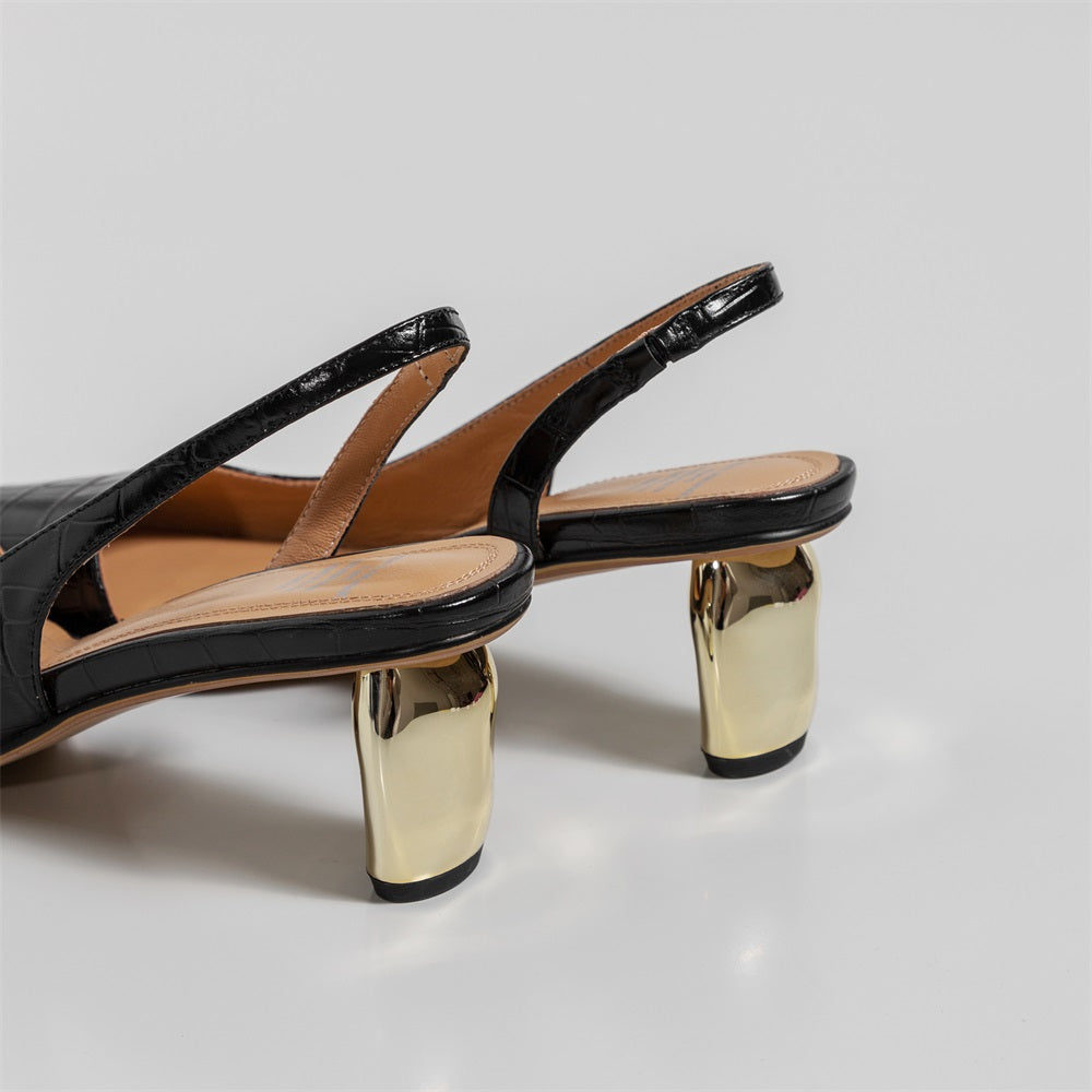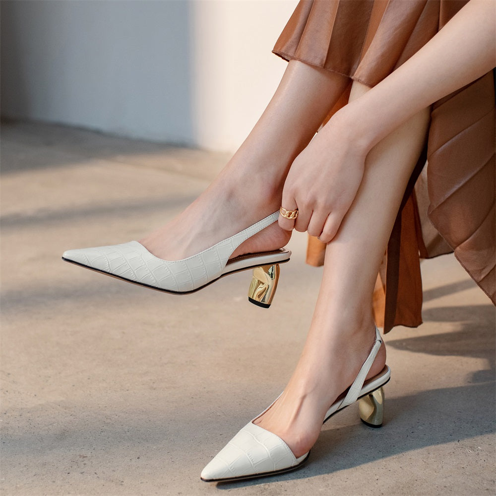 Animal Skin Patterned Genuine Cow Leather Slingback Shoes with Unique Chunky Heels, Open Side, and Pointed Toe