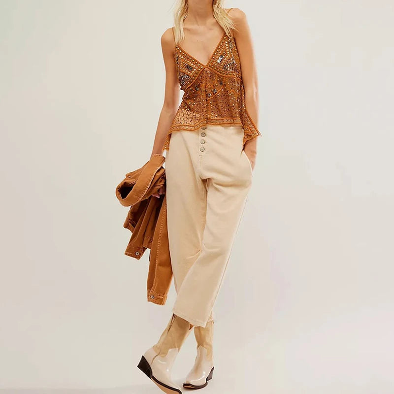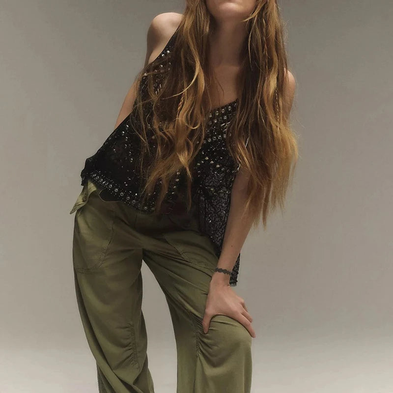 Unapologetic Muse Tank Top Make a fearless statement in this provocative tank top that refuses to blend in. Shimmering sequins catch every light while strategic hollow-out cutouts reveal just enough to intrigue. Built for the bold spirit who thrives on attention, this piece demands confidence and delivers pure edge. Whether you're hitting the club or commanding a room, wear it like you own the place—because you do.