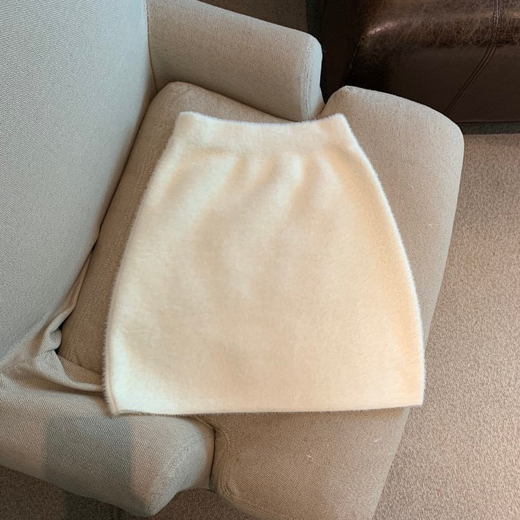 It's a mini skirt that is solid in color and made of acrylic material. It's perfect for those chilly days when you need to wear something warm.