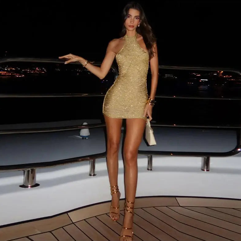 Gold Shimmer Knit Halter Mini Dress