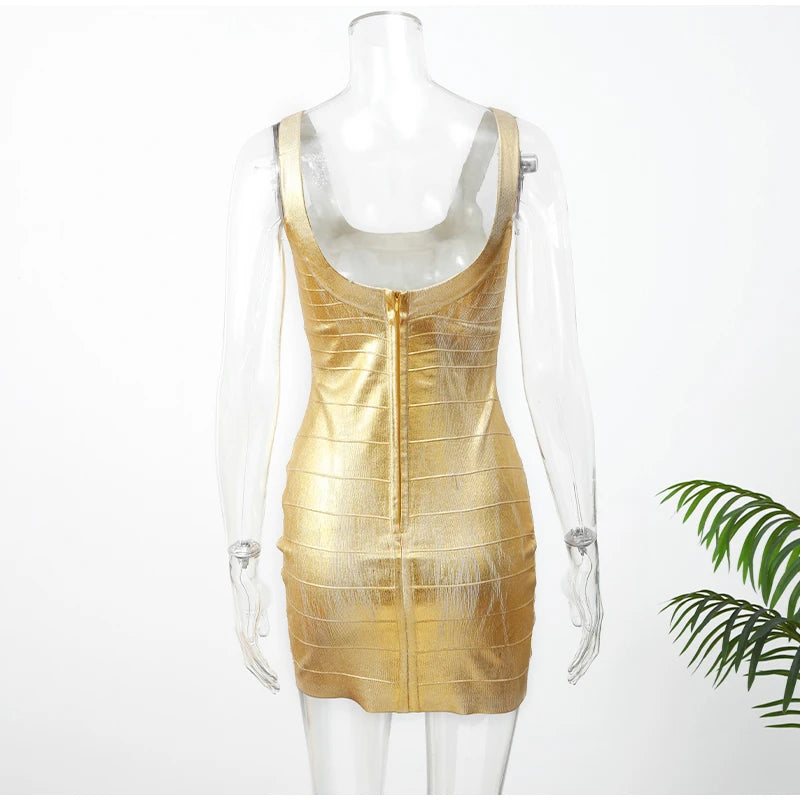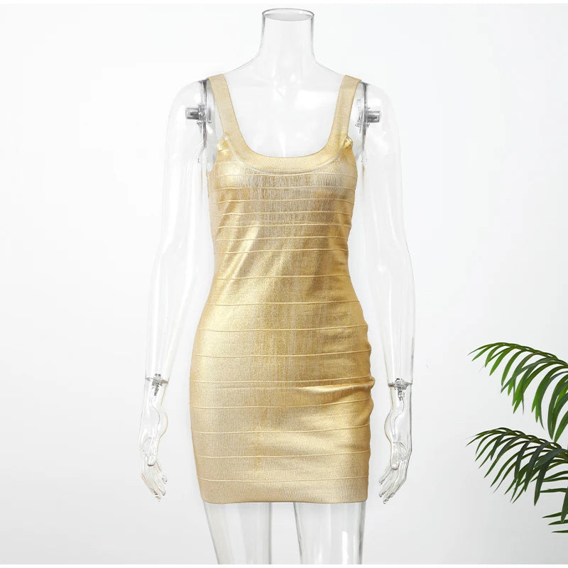 Unleash your boldest self in this striking sleeveless mini dress, where golden stripes command attention with every move. The clean, minimalist silhouette pairs fearless style with flattering simplicity—perfect for those ready to turn heads. Whether you're hitting the town or making a statement at an event, this dress delivers edge and elegance in one daring package. Slip it on and own the room.