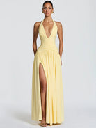 Elegant halter deep V neck backless long dress designed for sophisticated occasions. The plunging neckline and open back create a striking silhouette, while the flowing length offers timeless glamour. Perfect for evening events, formal dinners, or special celebrations. The halter neckline provides secure support with a modern, daring aesthetic. Crafted for those seeking a statement piece that combines sensuality with refined style.