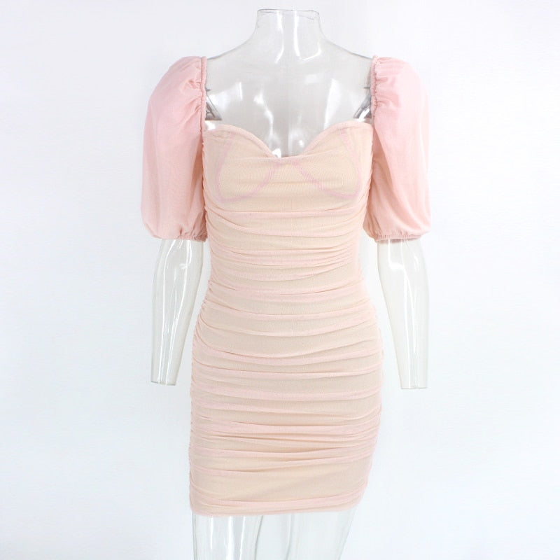 Polyester on Sheath Square Collar Puff Sleeve Mini Dress