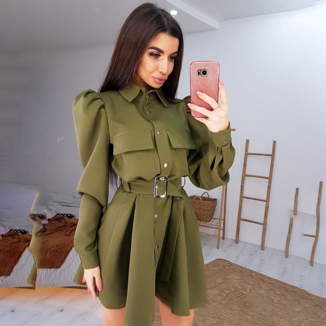 Solid Color Mini Dress With Pocket, Belt, And Puff Sleeve Decoration, Cotton Polyester Material