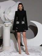 She Won Anyway Mini Dress features dramatic cloak sleeves that command attention with their flowing, theatrical silhouette. Adorned with shimmering rhinestone embellishments, this piece radiates confidence and bold elegance. Wear it like you've already won.