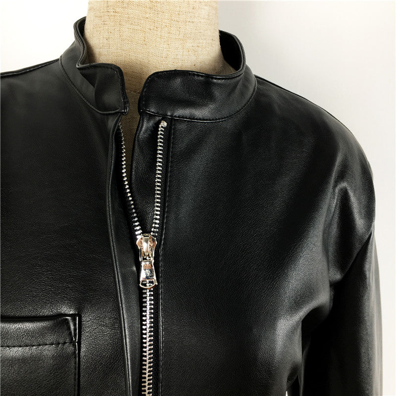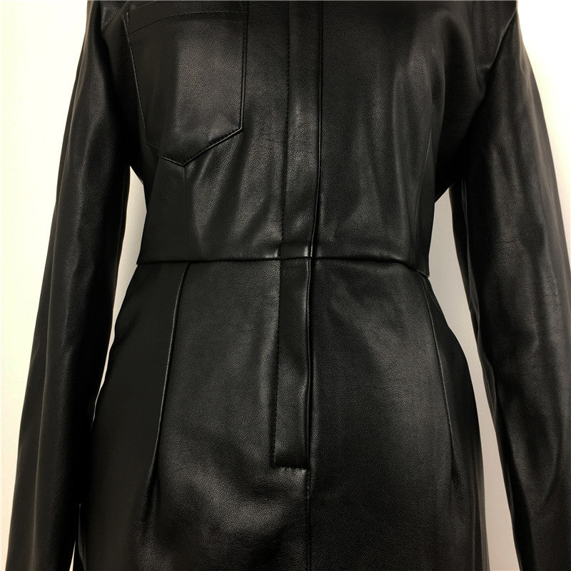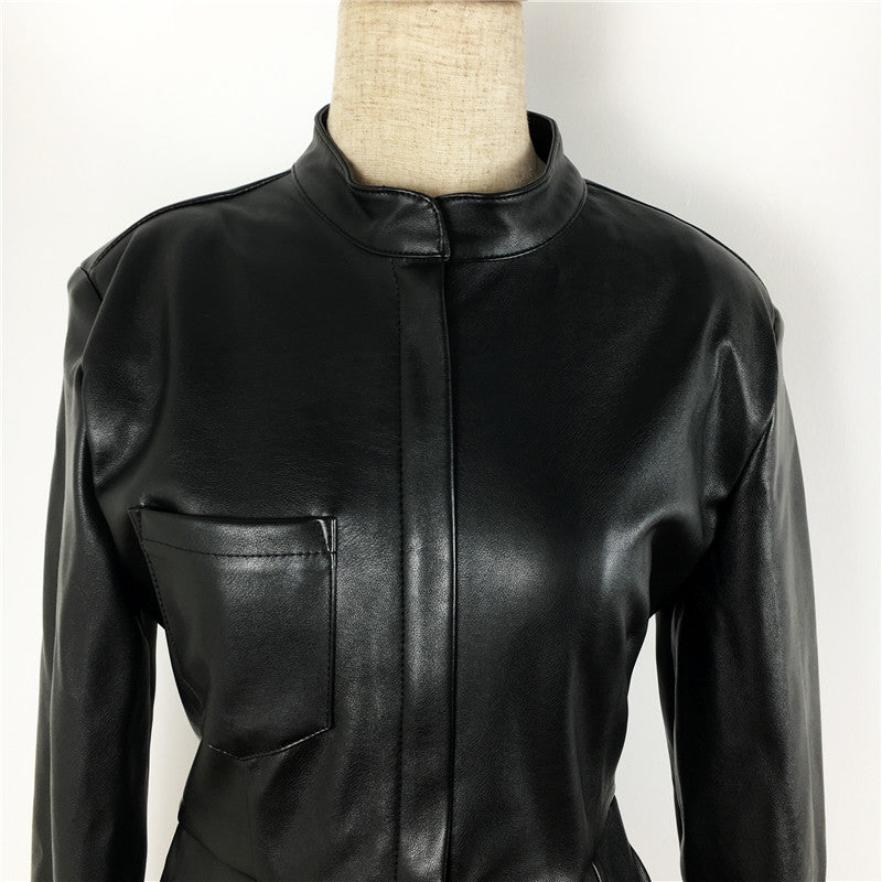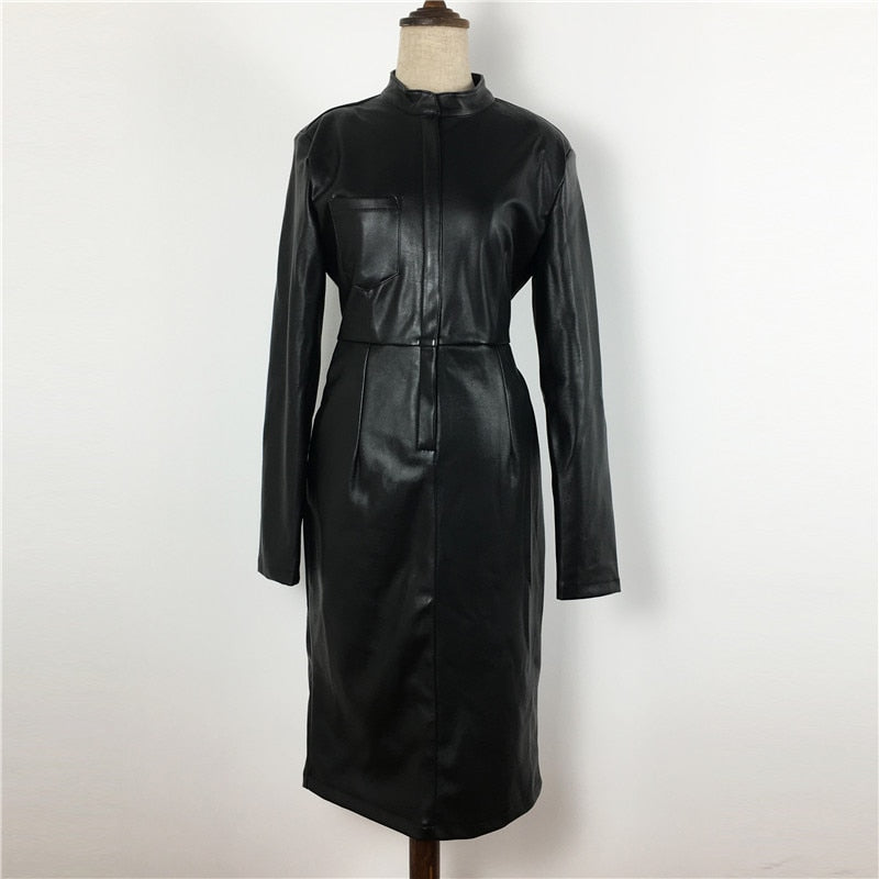 Long Sleeve Solid Midi Dress with Zipper Closure, Stand Collar, and PU Leather Material
