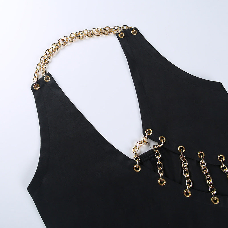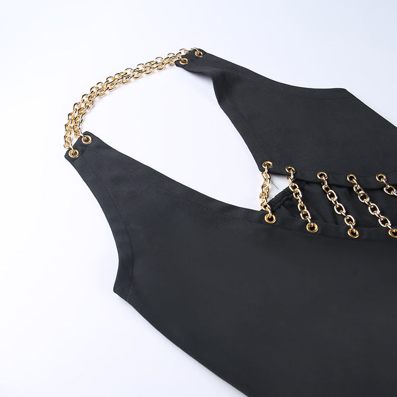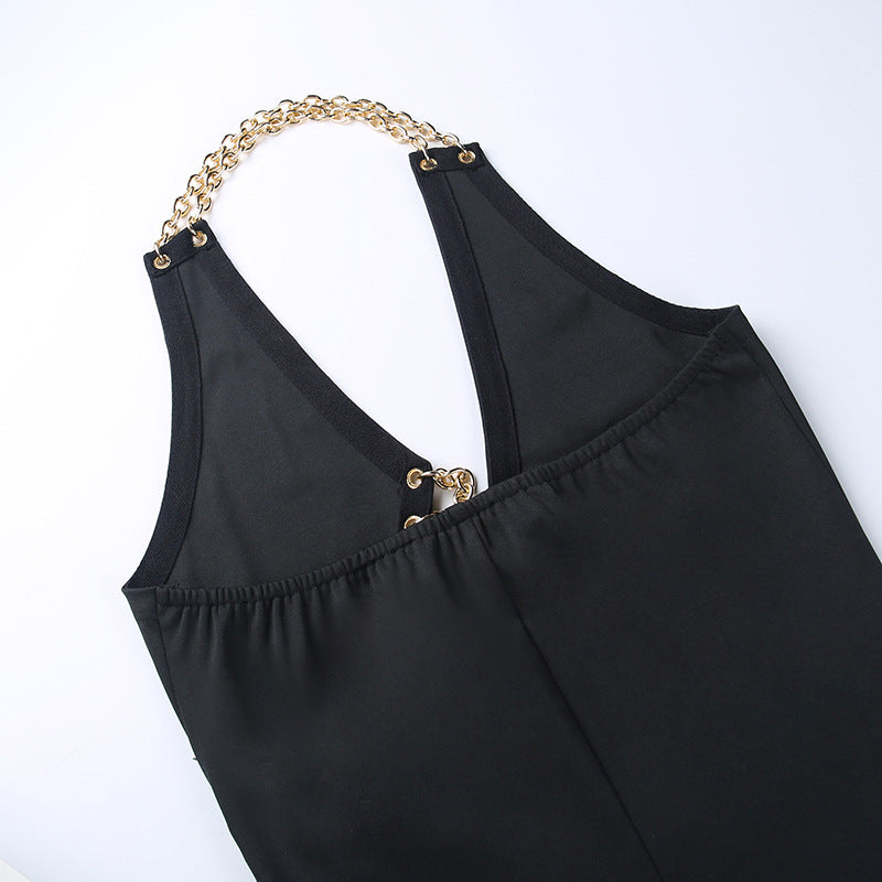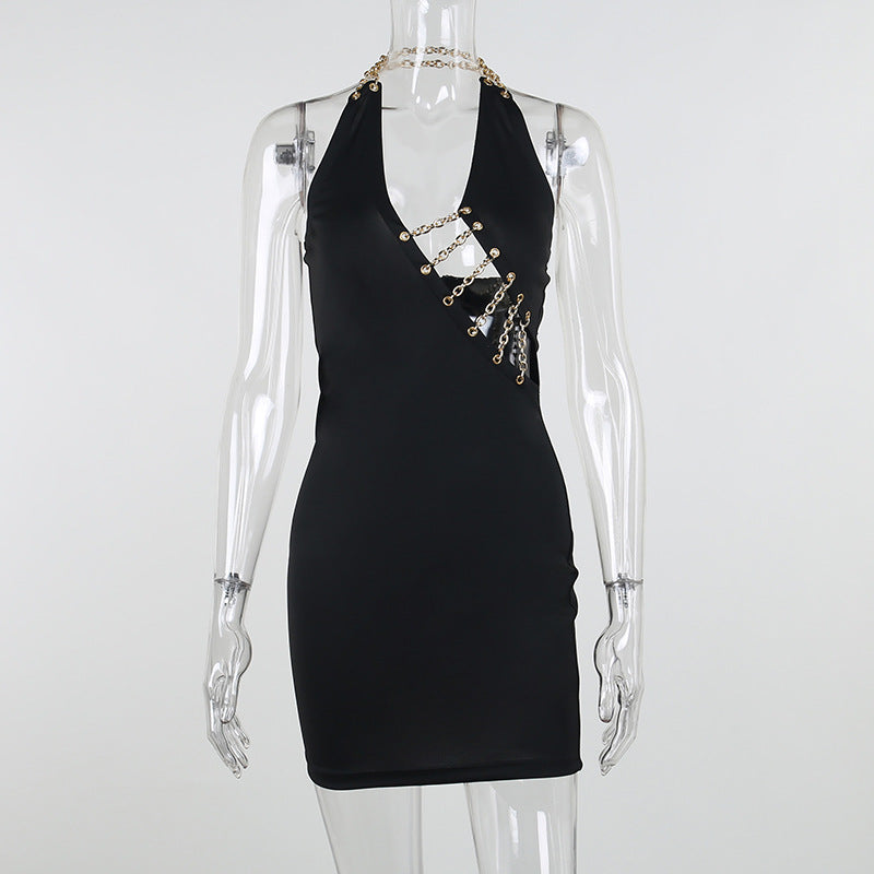 Looking for an easy-to-wear dress with the perfect fit? Look no further than this gorgeous halter neck dress. The elegant and simple design is perfect for any occasion. A long chain strap adds a trendy and feminine touch.