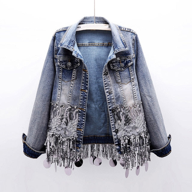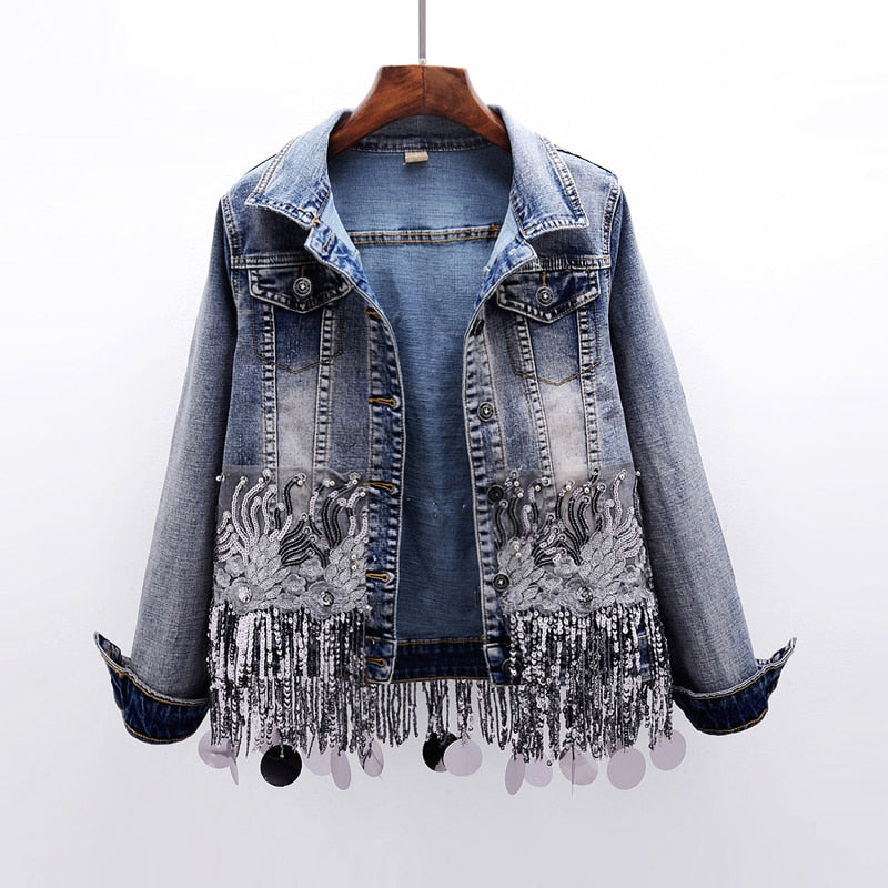 Polyester Cotton on Turn-down Collar Zipper Round Chain Denim Jacket