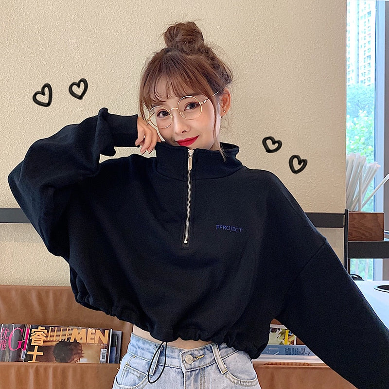 This solid sweater is made from cotton polyester with a front zipper. It has a drawstring at the bottom edge. Can be worn as a stand collar or turn-down collar.